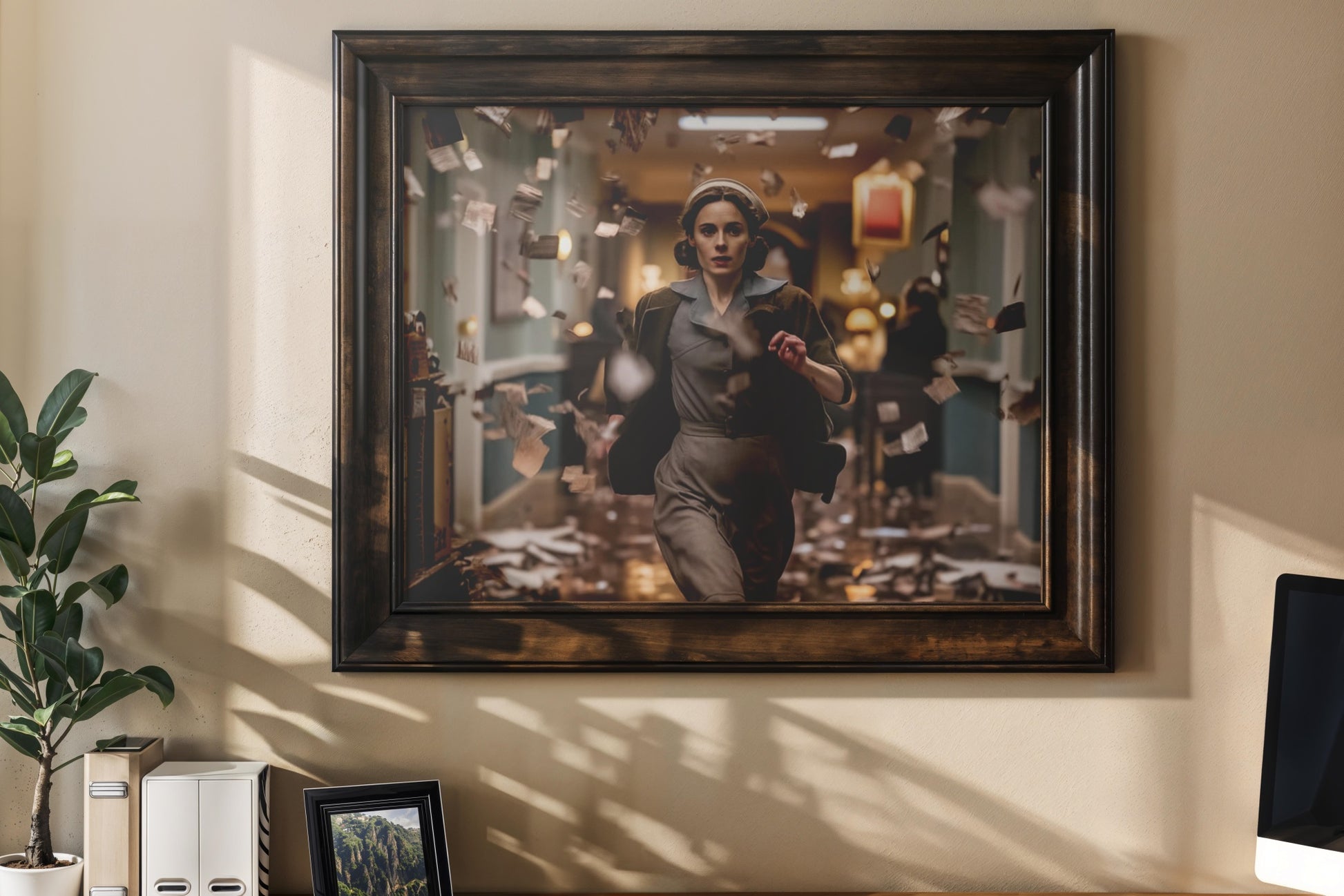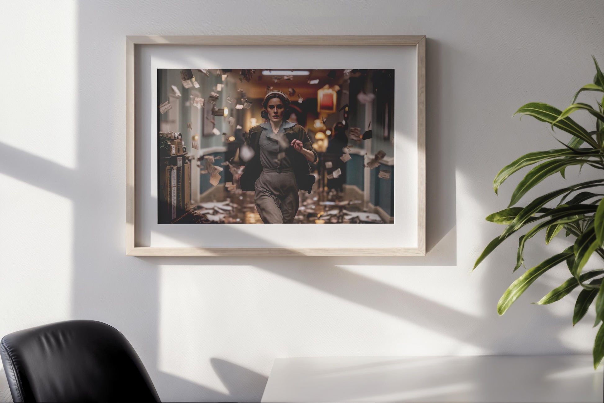 Run Through the Storm of Letters captures a dramatic cinematic moment— a woman in vintage attire runs through a corridor filled with swirling papers, as though caught between urgency, war-time secrets, and resistance. The artwork blends cinematic realism with retro European aesthetics, evoking emotion, suspense, and narrative depth.