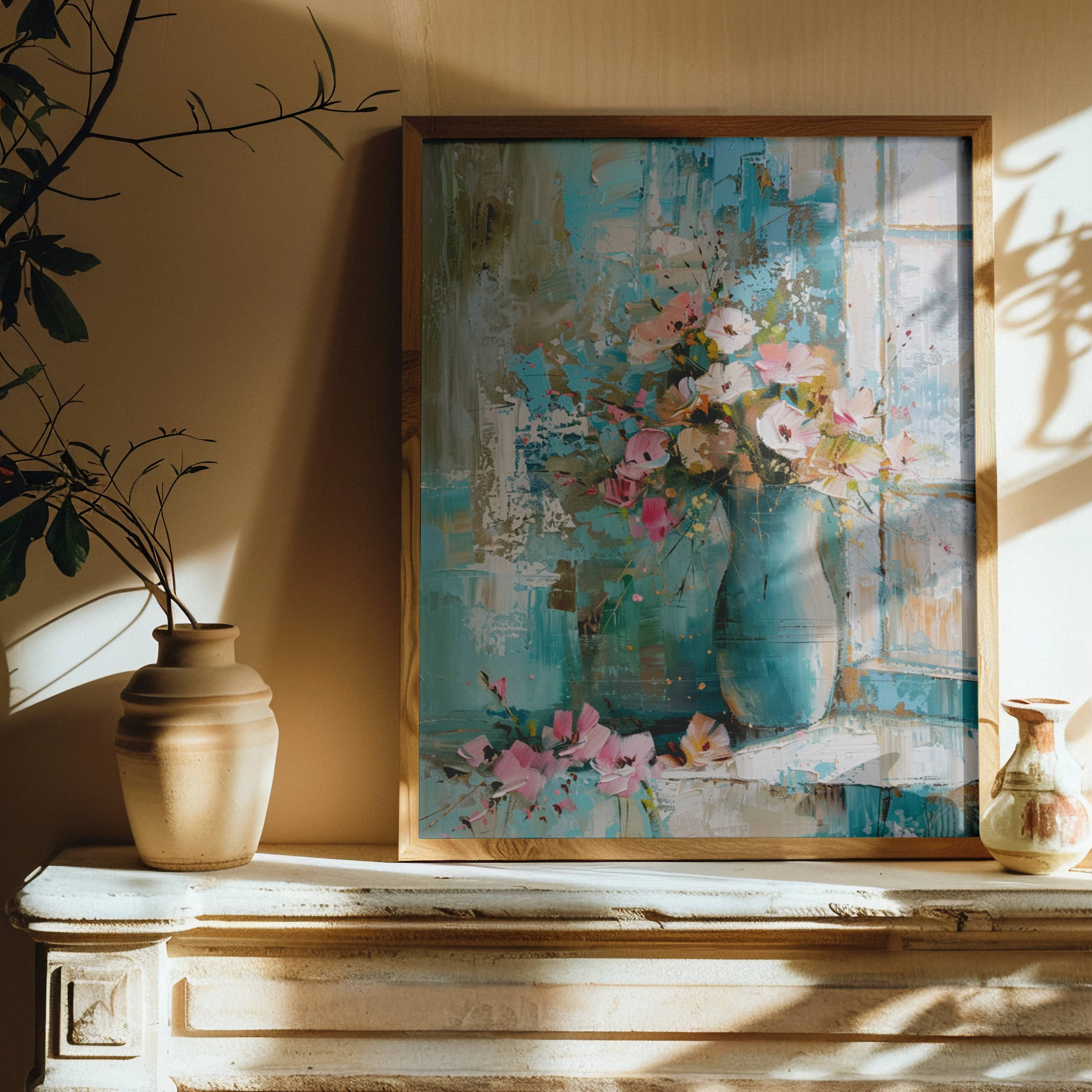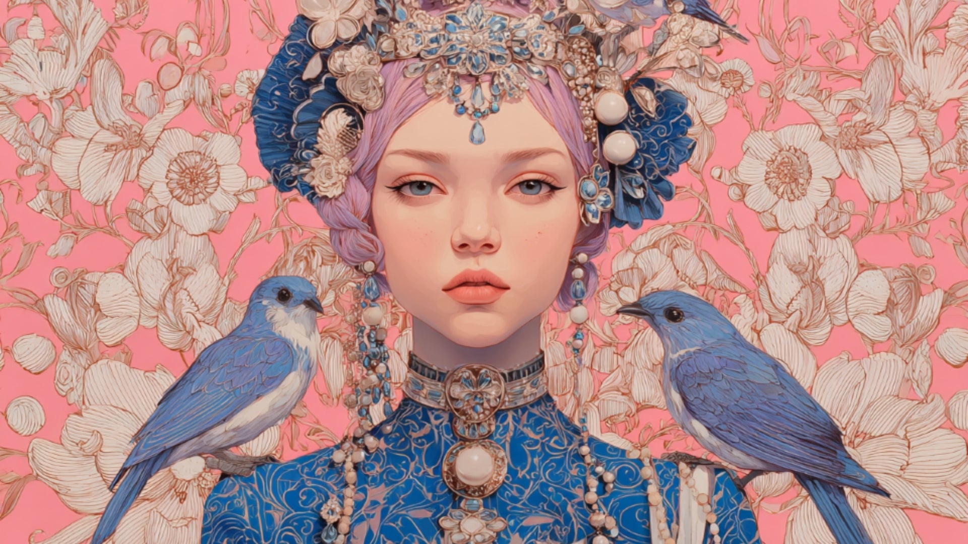 Delve into a world of elegance, where soft blues and radiant florals intertwine, capturing the timeless grace of nature’s delicate creatures. A captivating digital masterpiece that brings sophistication and charm to any space.