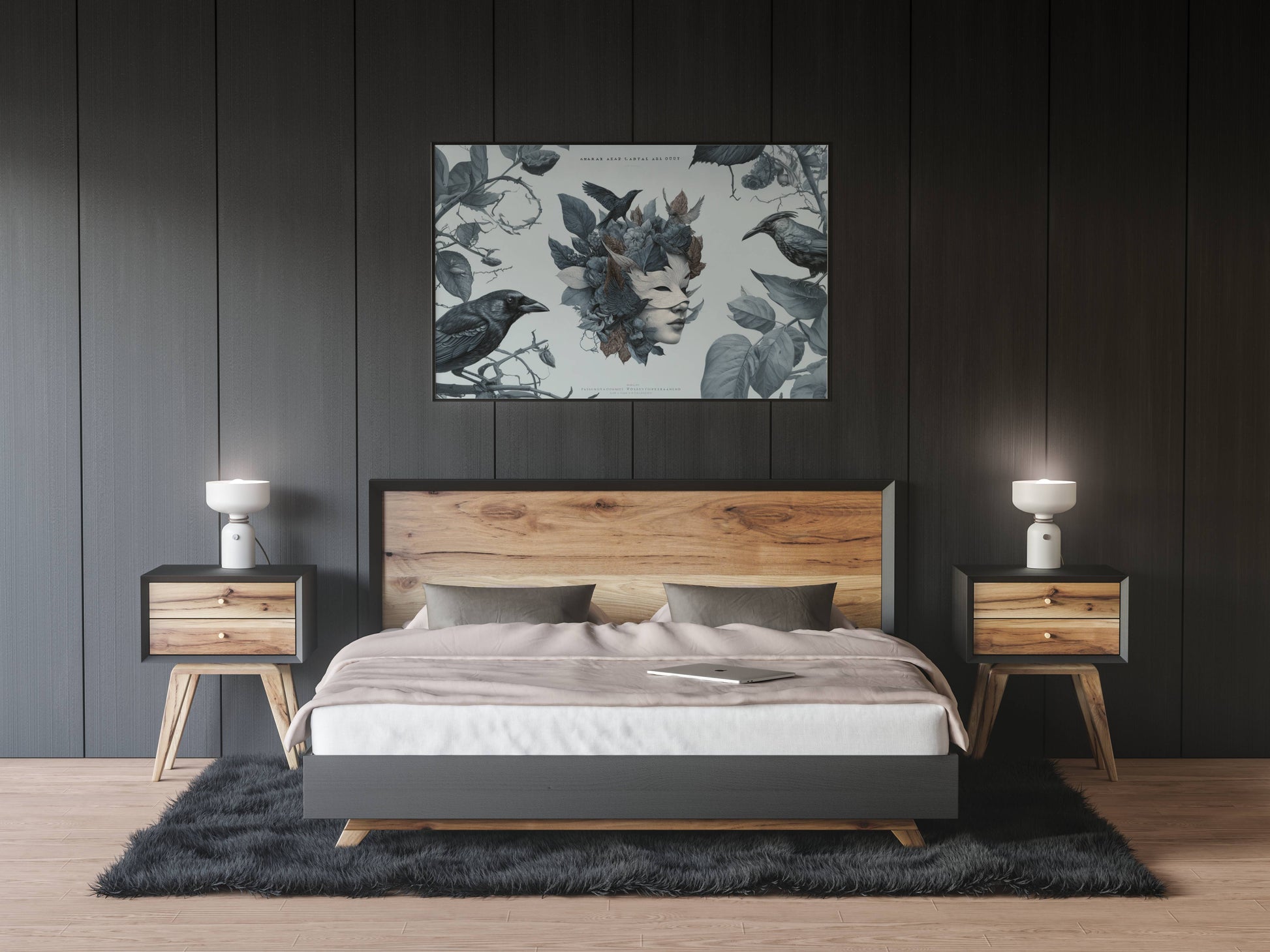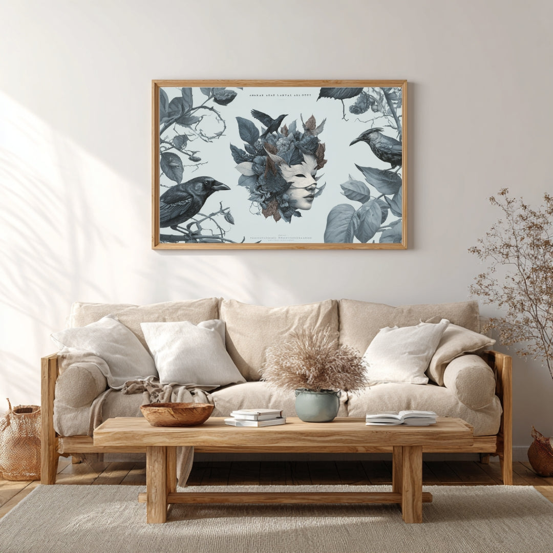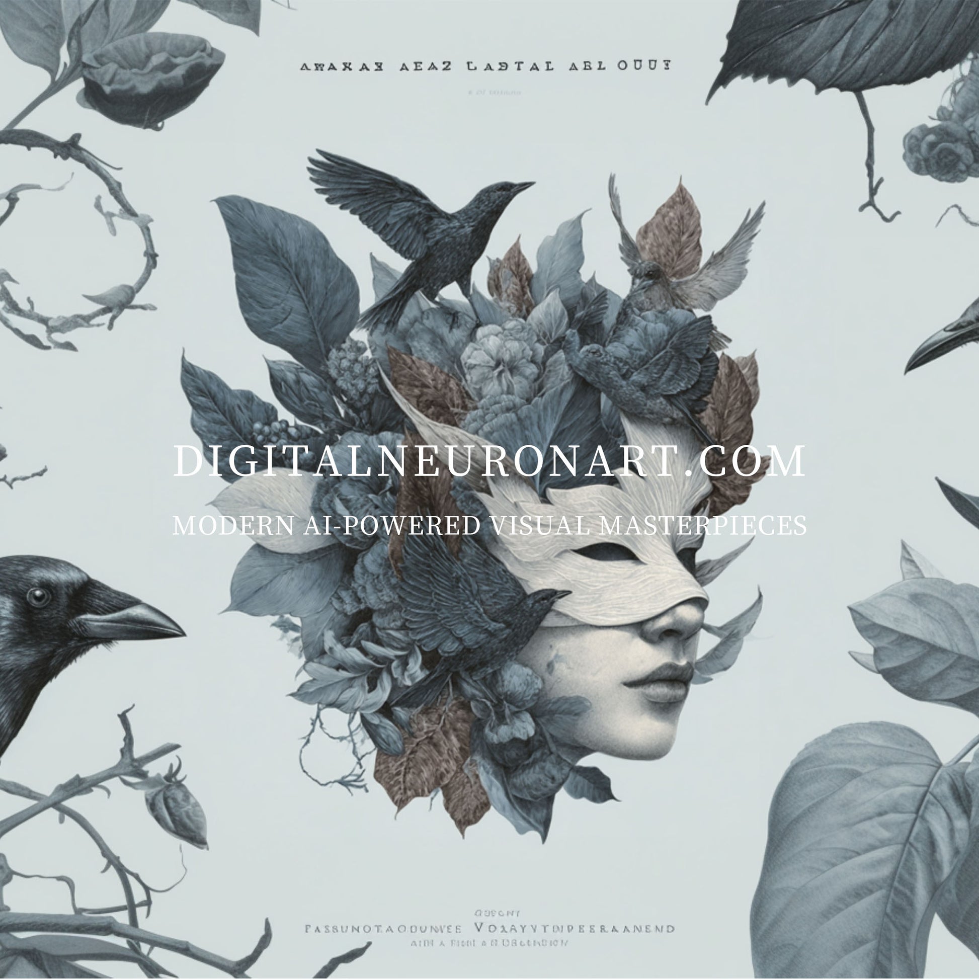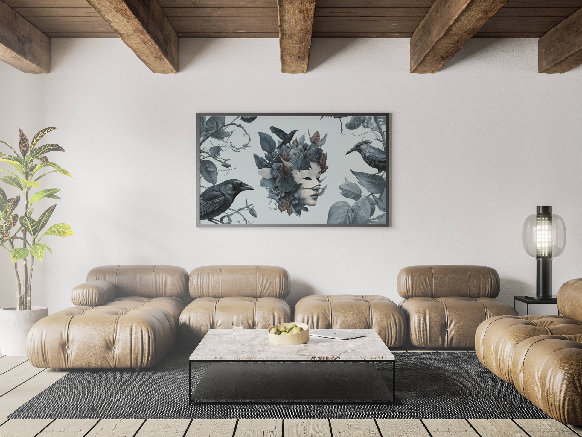 沉浸在《鸟鸣遐想》这幅迷人的数字艺术作品中,沉浸在一个空灵而美丽的世界。这幅作品将现实主义与复杂的花卉和鸟类图案融为一体,展现了一幅充满力量的年轻女子肖像,她被一群翩翩飞舞的鸟儿包围,周围环绕着旋转的花朵,所有元素都以柔和的米色和蓝色呈现。这幅作品完美地提升了任何现代或极简主义空间的格调,捕捉了宁静与动感,通过自然与人文之间的微妙平衡,传递着一种情感上的联系。