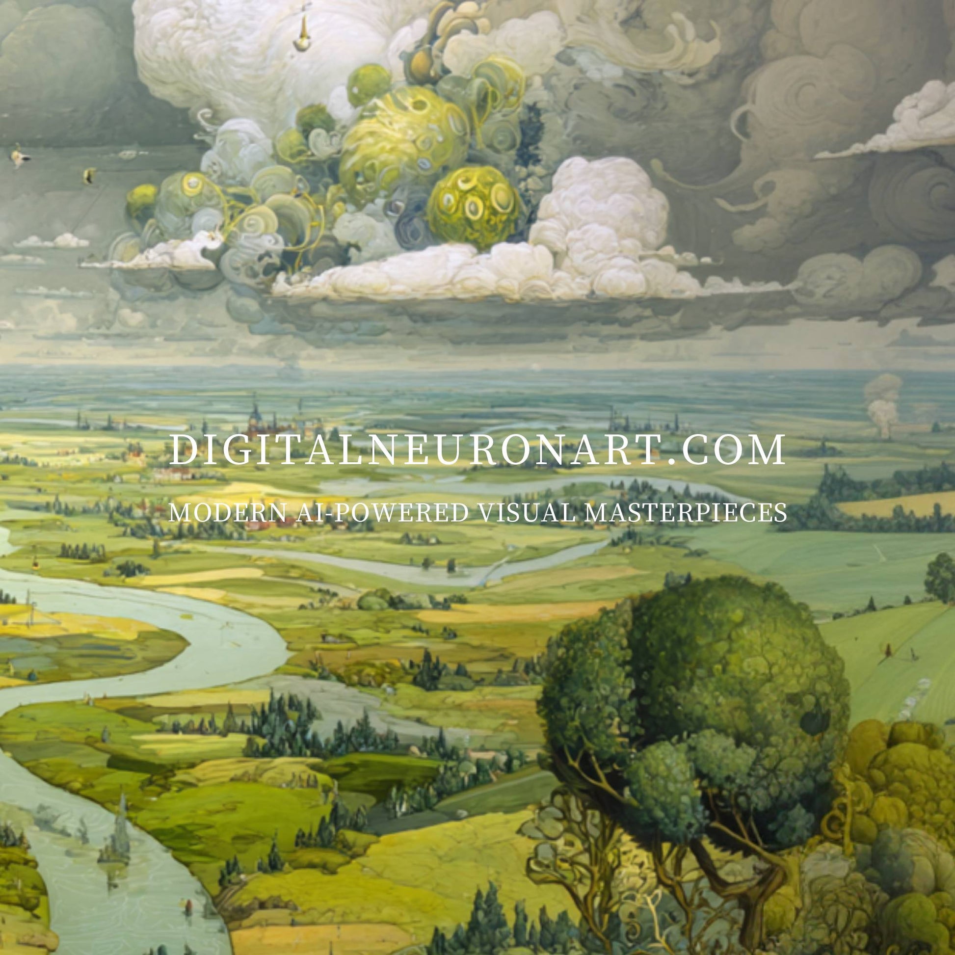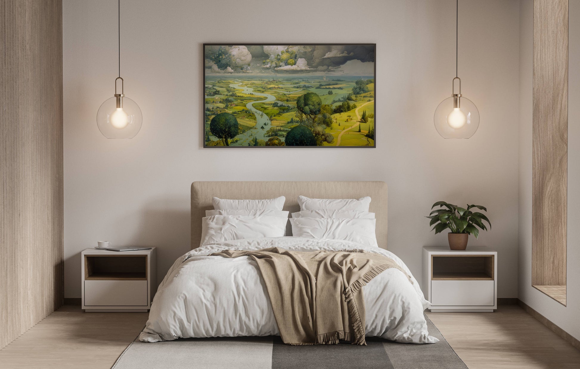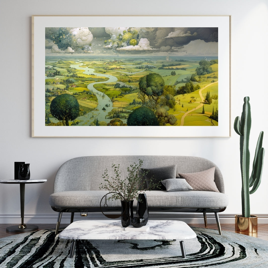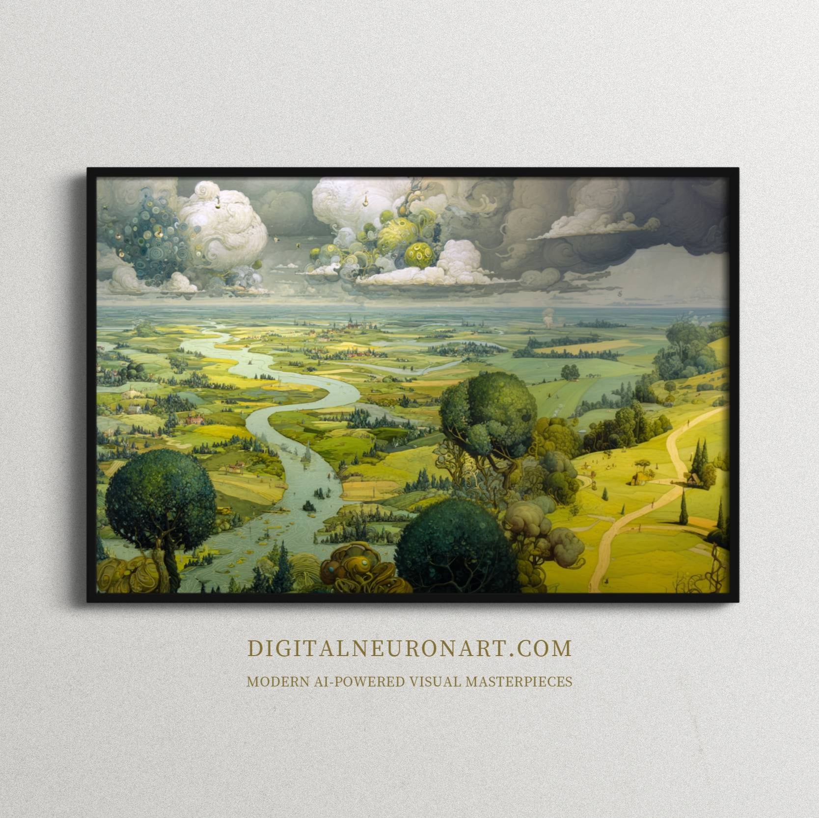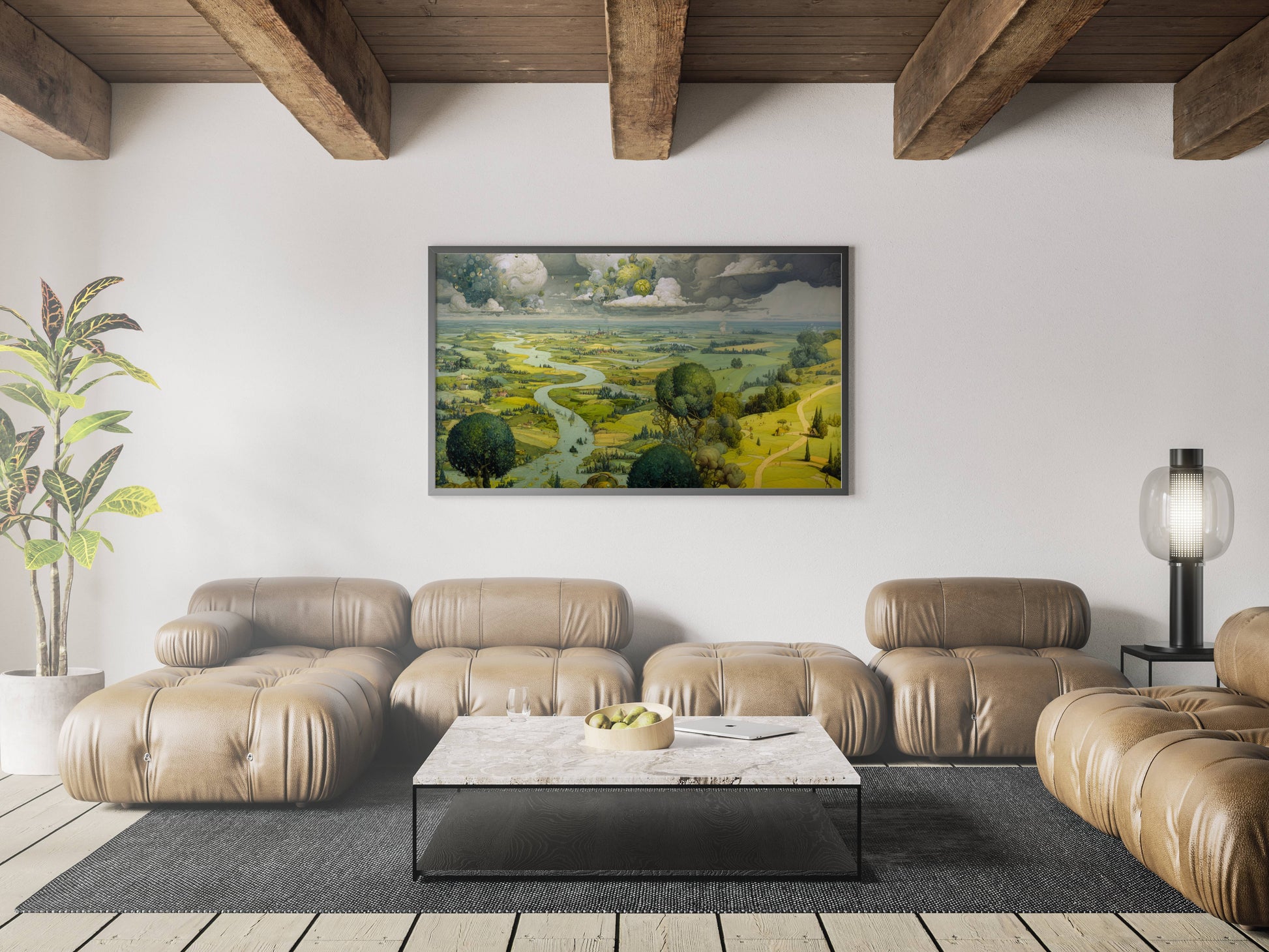 《无尽地平线》将带您进入一个广阔的景观和超现实天空的世界。蜿蜒的河流和连绵起伏的山丘,郁郁葱葱的绿色与头顶上翻腾的云彩形成鲜明对比。这幅令人惊叹的作品捕捉了令人惊叹的自然之美,为自然世界提供了如梦似幻的诠释。对于任何欣赏广阔而大气、能唤起奇妙与宁静之感的艺术作品的人来说,这幅作品都是完美的选择。