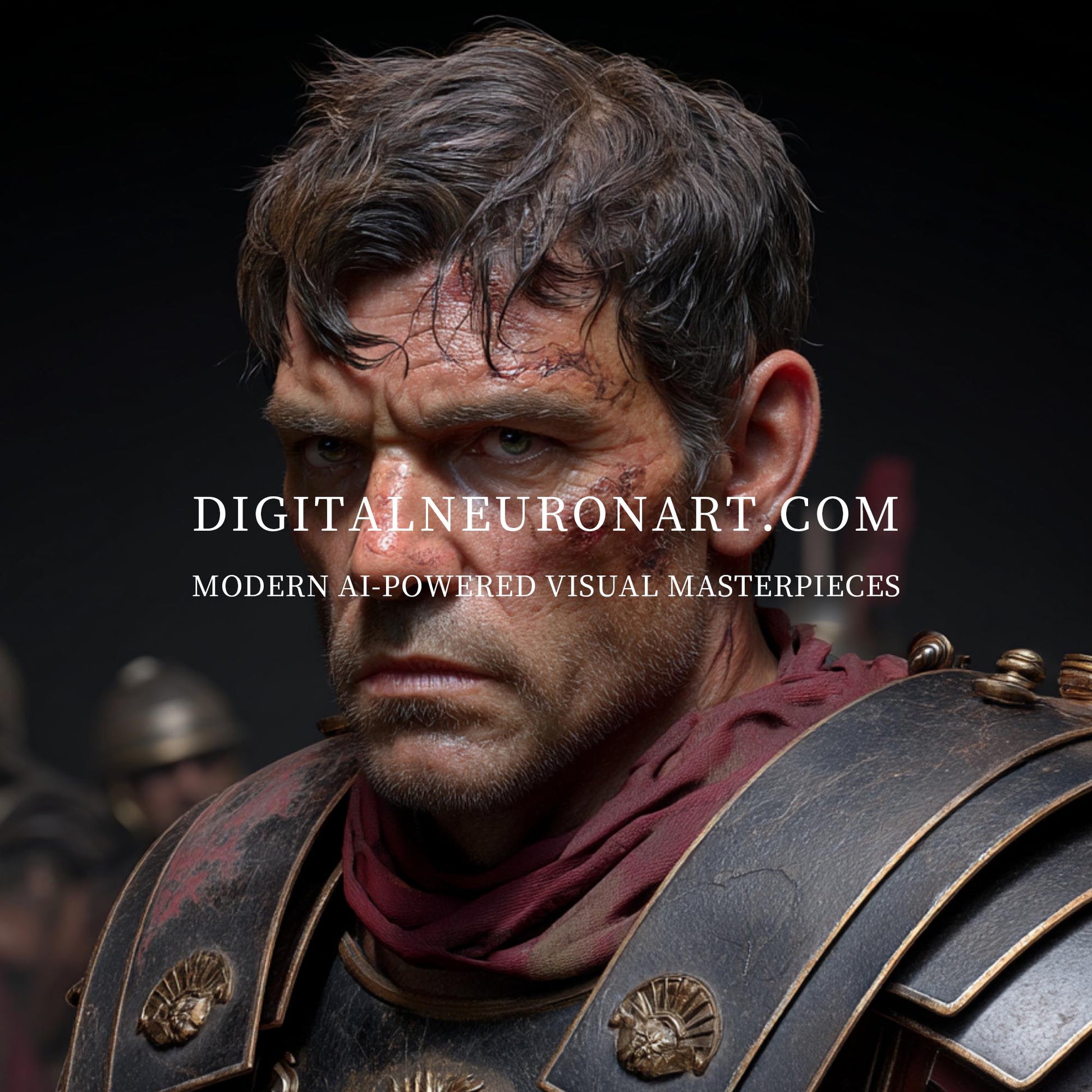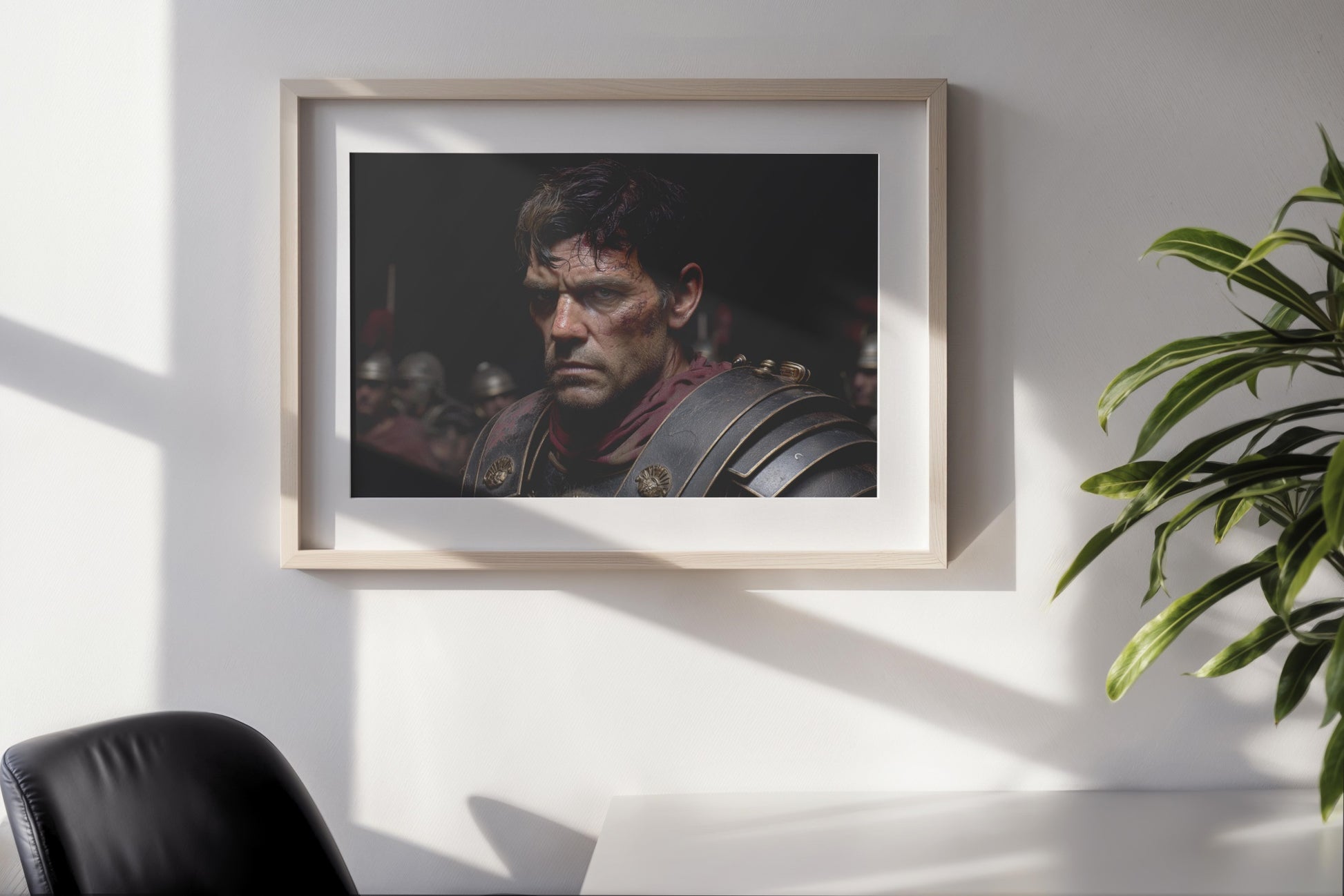 This striking digital artwork captures the intensity of a Roman warrior, scarred from battle yet resolute in spirit. Rendered in cinematic realism, every detail—from the glint of his armor to the grit on his face—brings history to life with dramatic authenticity. Ideal for fans of ancient Rome, military history, or collectors of epic portrait art. Delivered as a high-resolution digital download, perfect for printing as posters, canvas, or framed wall decor.