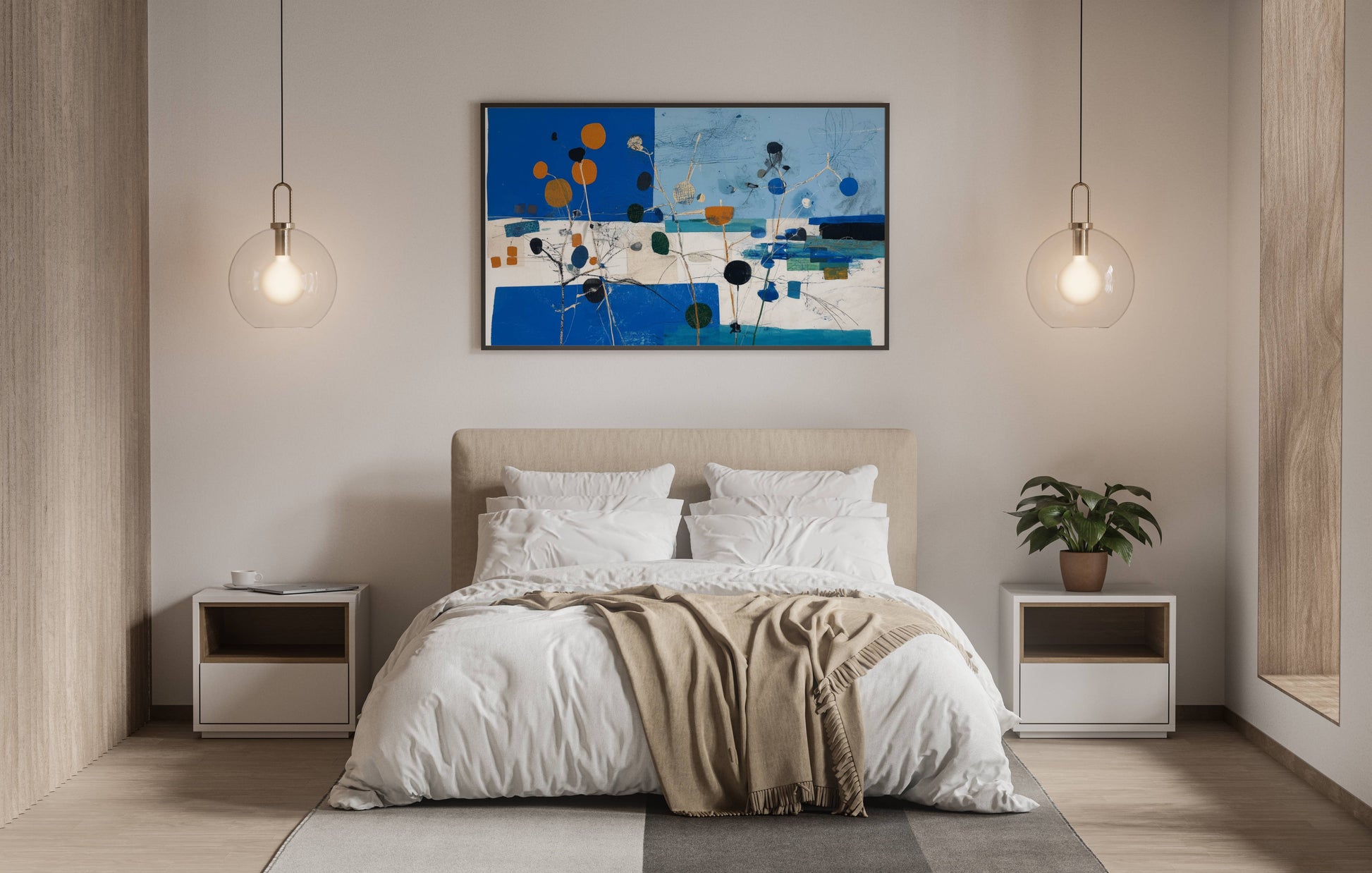 Bring a touch of modern elegance to your walls with Golden Blue Blooms. This abstract botanical landscape combines deep cobalt blue, sky tones, and warm golden accents, depicting delicate plant silhouettes and geometric shapes in a harmonious composition.