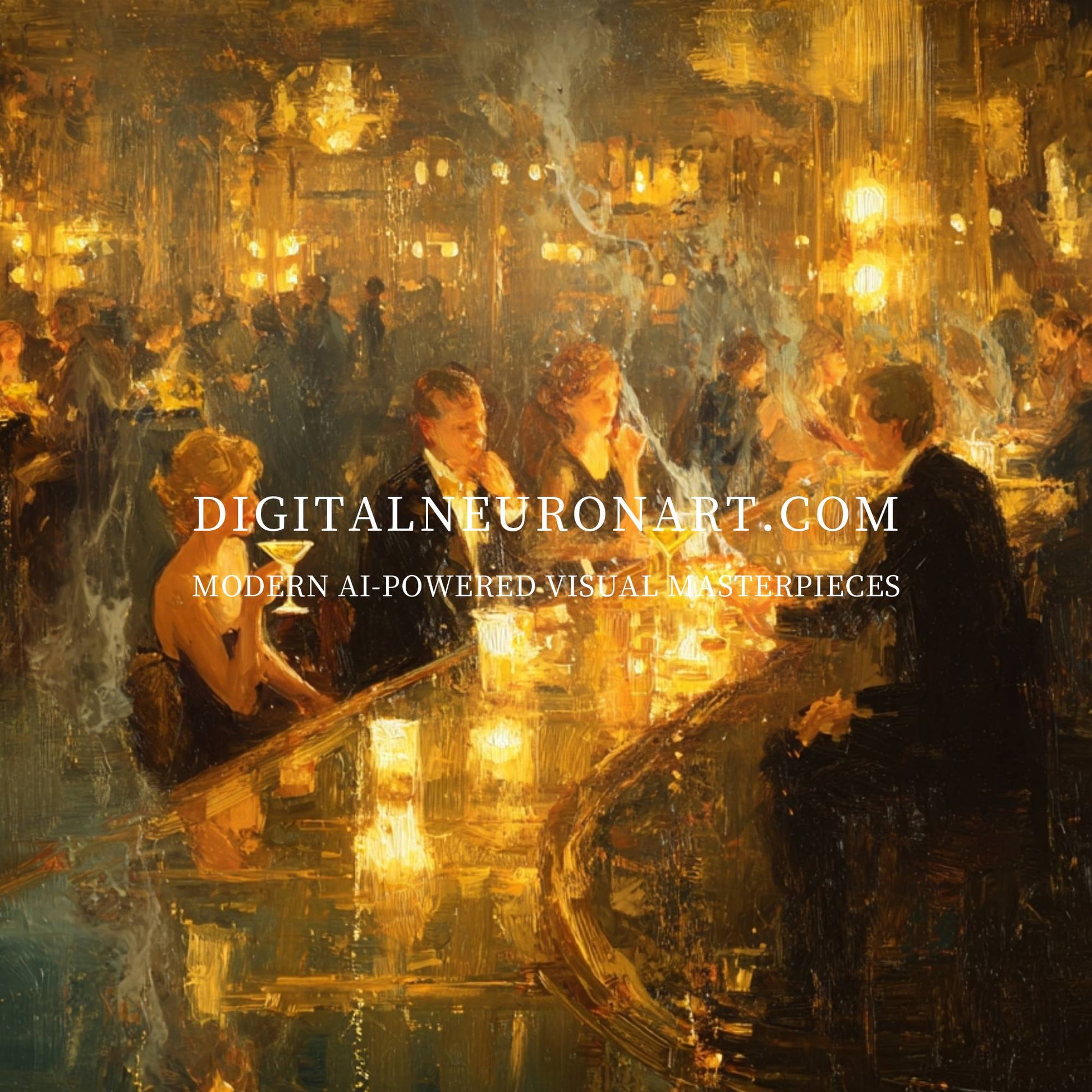酒吧沐浴在温暖的金色光芒中,静谧优雅。轻柔的笑声和轻柔的交谈交织在空气中,烛光摇曳,在抛光的酒杯和晚礼服上翩翩起舞。这一幕捕捉到了一个永恒的优雅时刻——陌生人和朋友在琥珀色的薄雾下相聚,每一口都仿佛步入另一个时代。