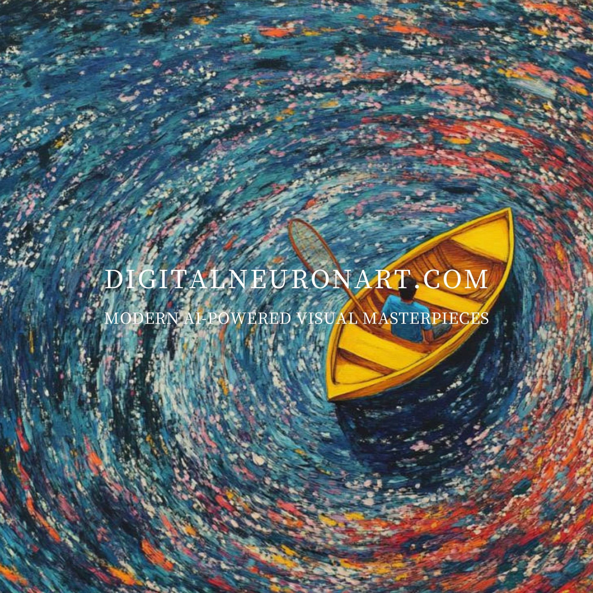 This captivating digital artwork depicts a lone yellow boat adrift in a swirling whirlpool of vibrant colors. Painted in a modern impressionist style, the bold brushstrokes of deep blue, purple, and fiery red capture both the beauty and uncertainty of life’s journey. The bright contrast of the golden boat against the dynamic water evokes resilience, solitude, and exploration. Delivered as a high-resolution digital download, this artwork is perfect for living rooms, studies, or creative spaces, bringing both movement and reflection into your home décor.