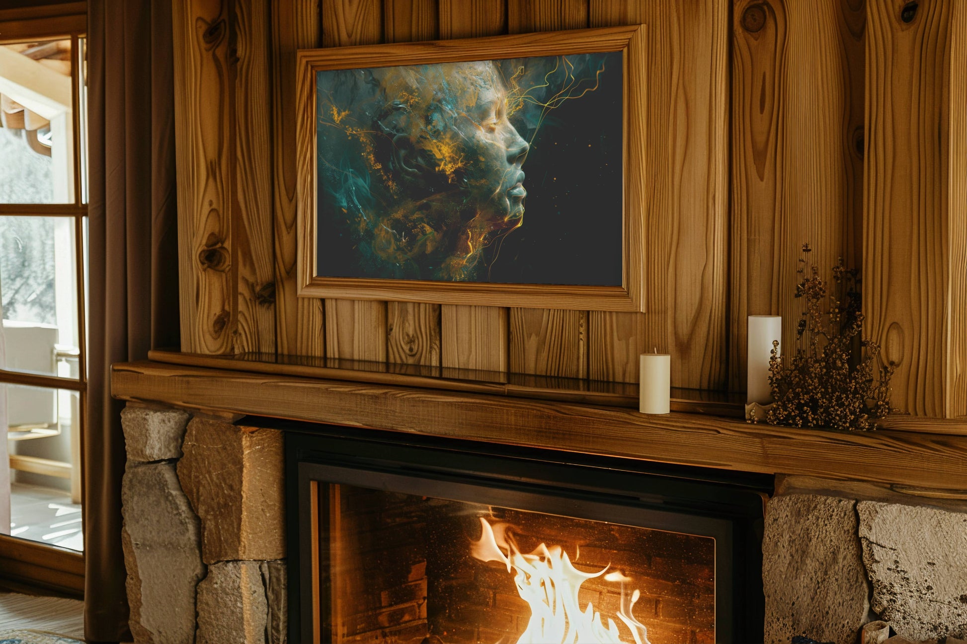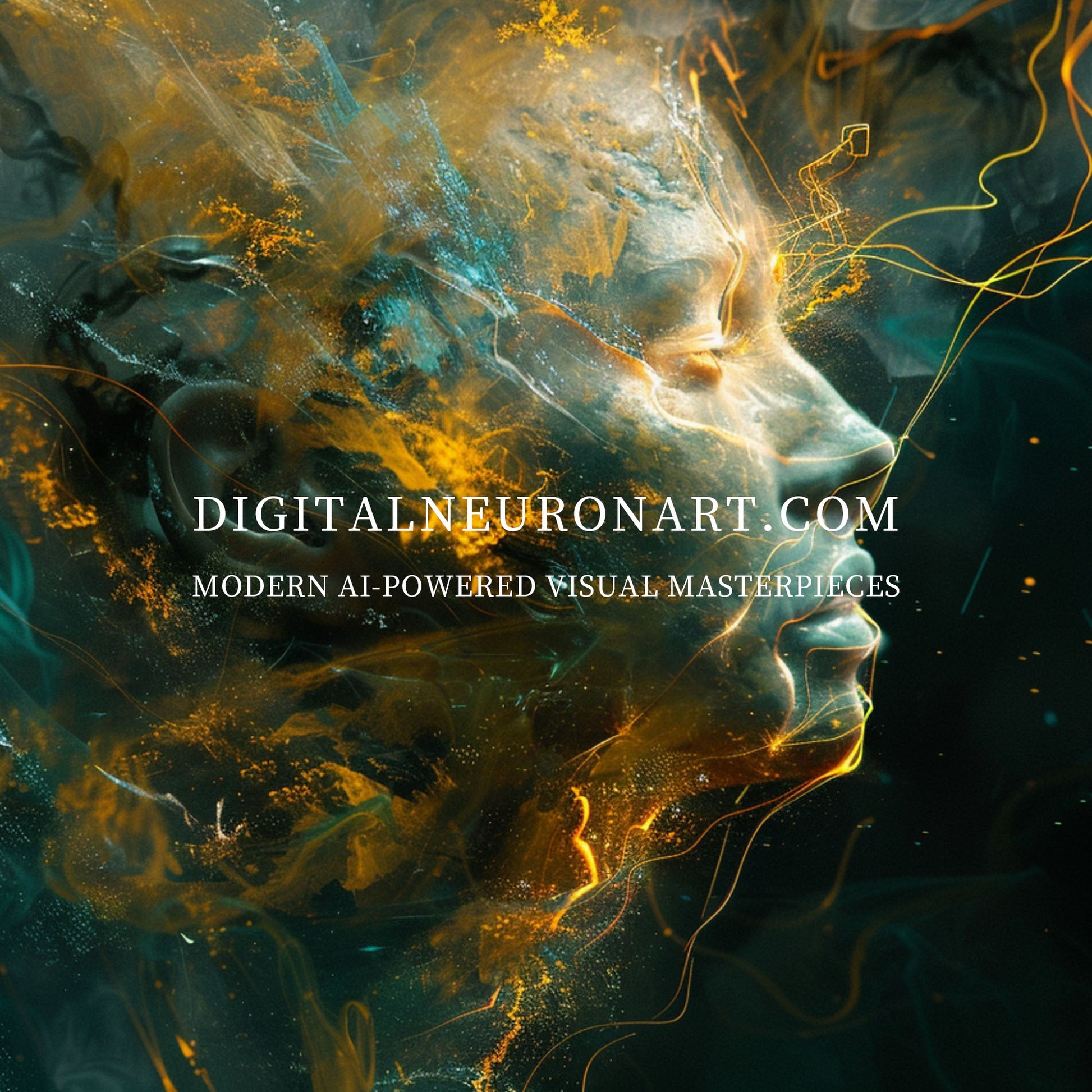 这幅人工智能生成的肖像画将自然的面部轮廓与抽象的能量流融合在一起,唤起了一种觉醒、蜕变和深层内在连接的感觉。电流的痕迹和金色的神经线在如梦似幻的氛围中盘旋——一半是天体,一半是数字。