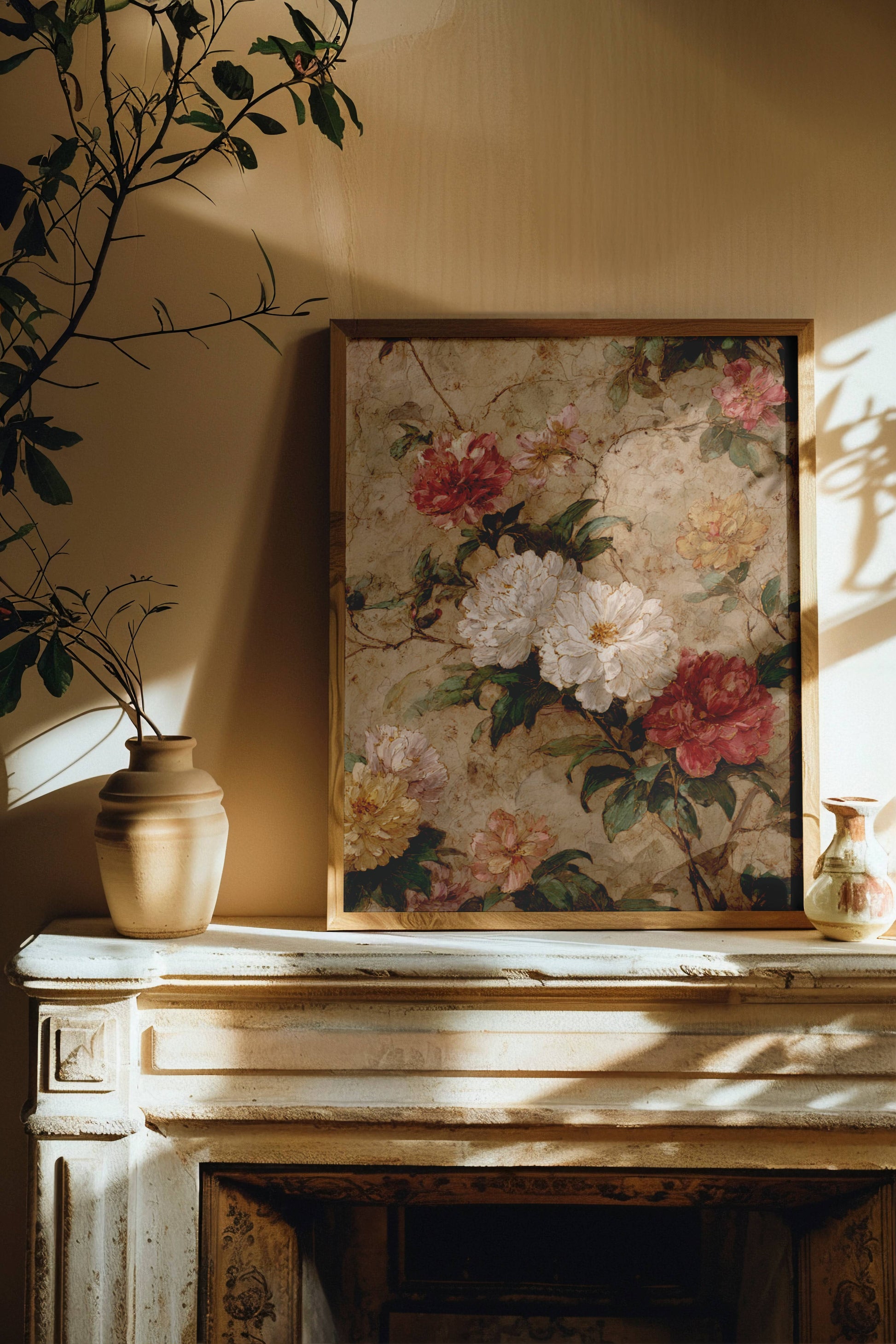 这幅作品的灵感源自古老的植物插图,以古典风格描绘了郁郁葱葱的白色、红色和淡黄色牡丹,并以纹理羊皮纸色调的背景为背景。非常适合传统室内设计、复古装饰爱好者,或任何想在画廊墙上增添精致花卉图案的人。