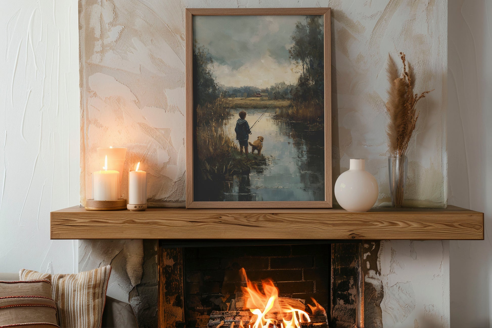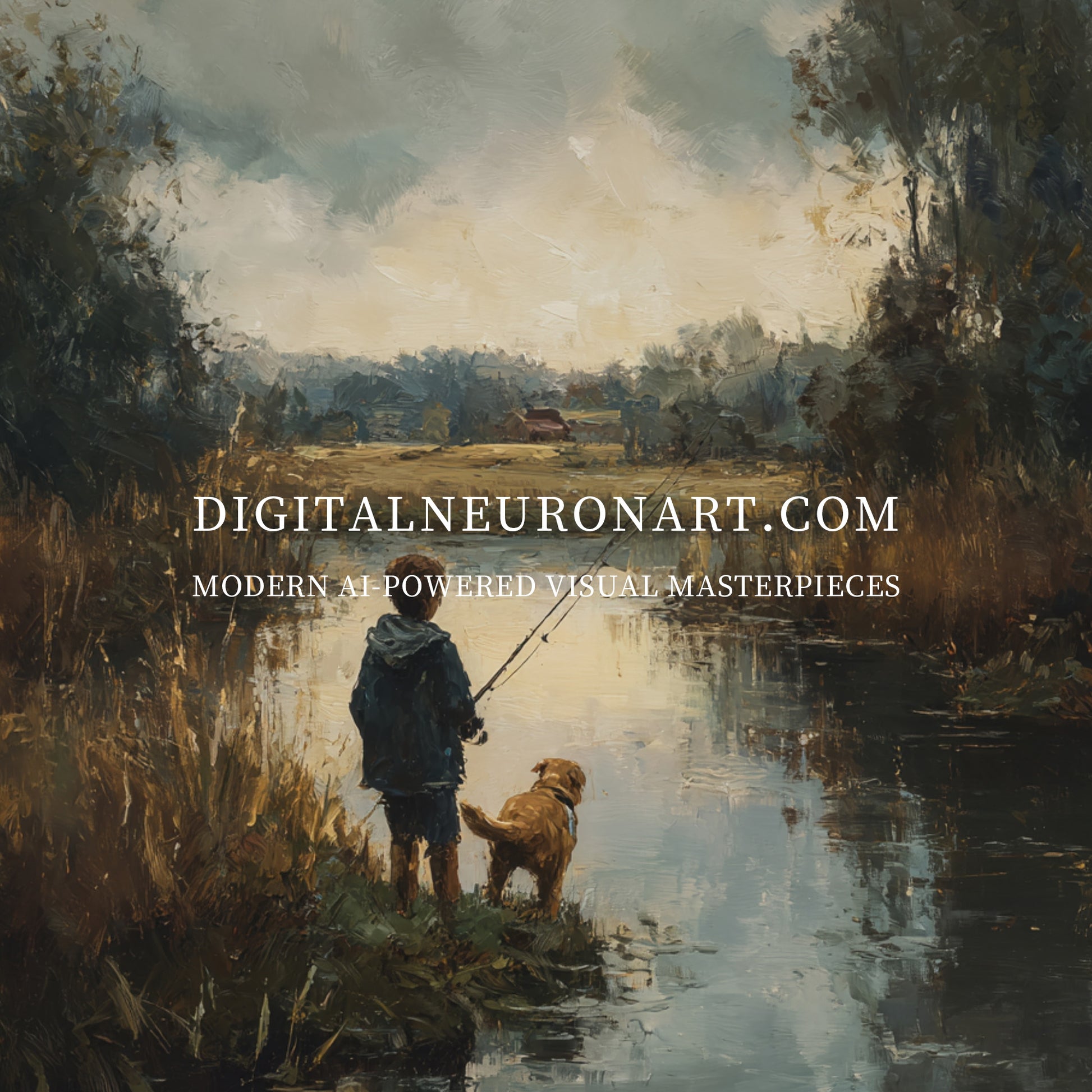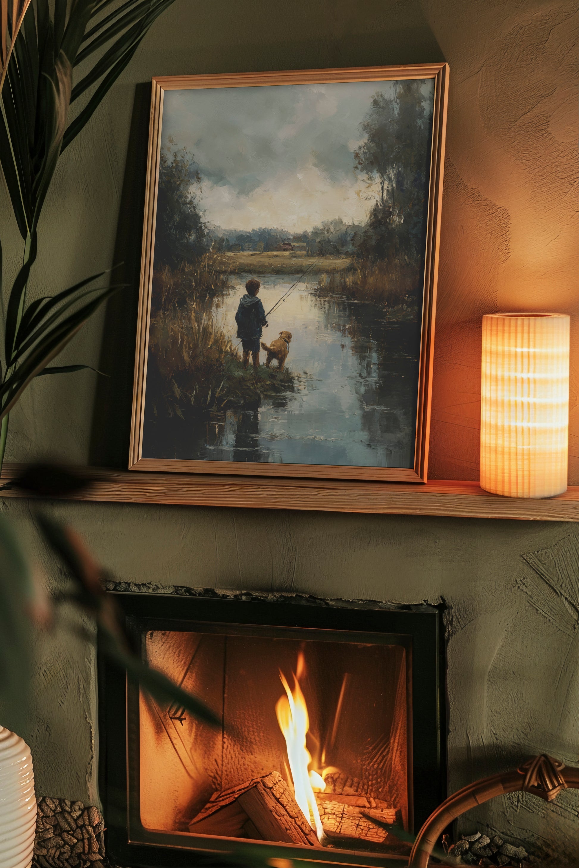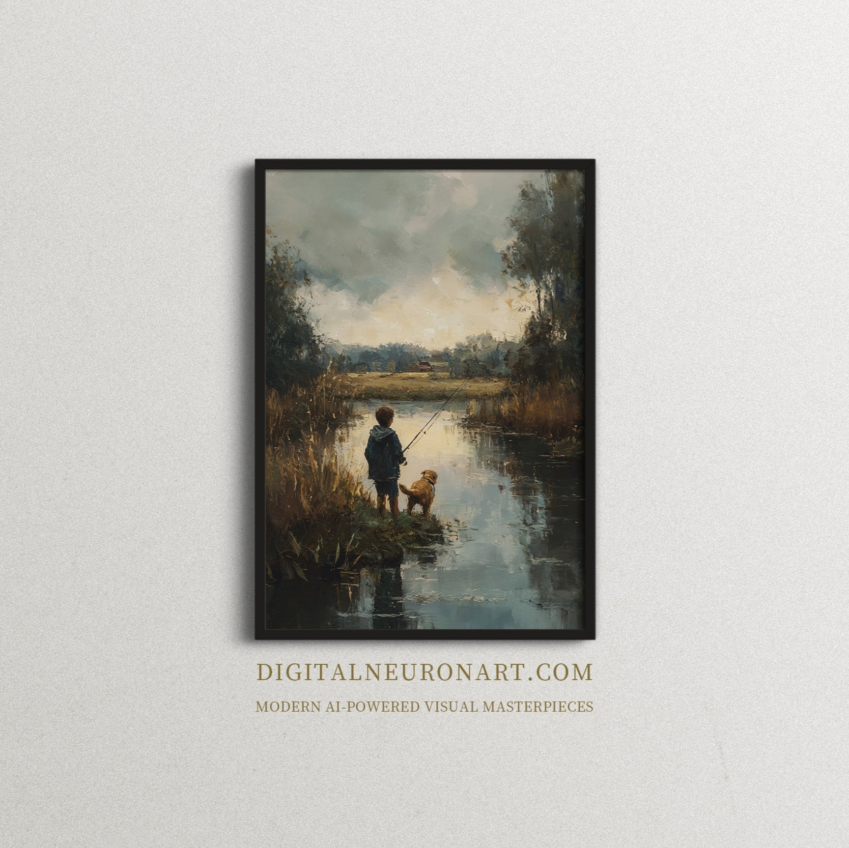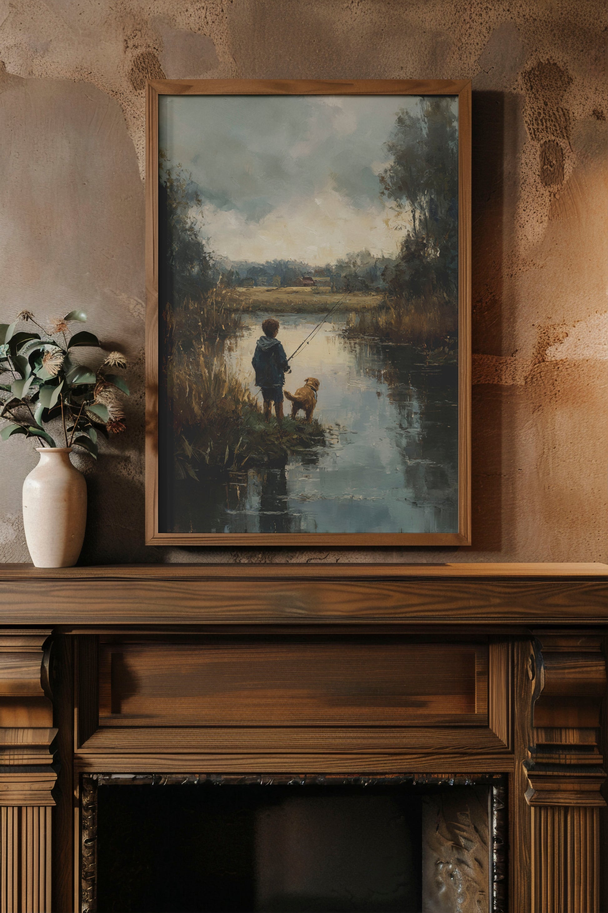 这幅精美的画作描绘了一个孩子和他忠诚的狗狗在水边钓鱼的场景,为您的家增添永恒的优雅。舒缓的泥土色调和宁静的自然环境,唤起了一种怀旧与平和的感觉。