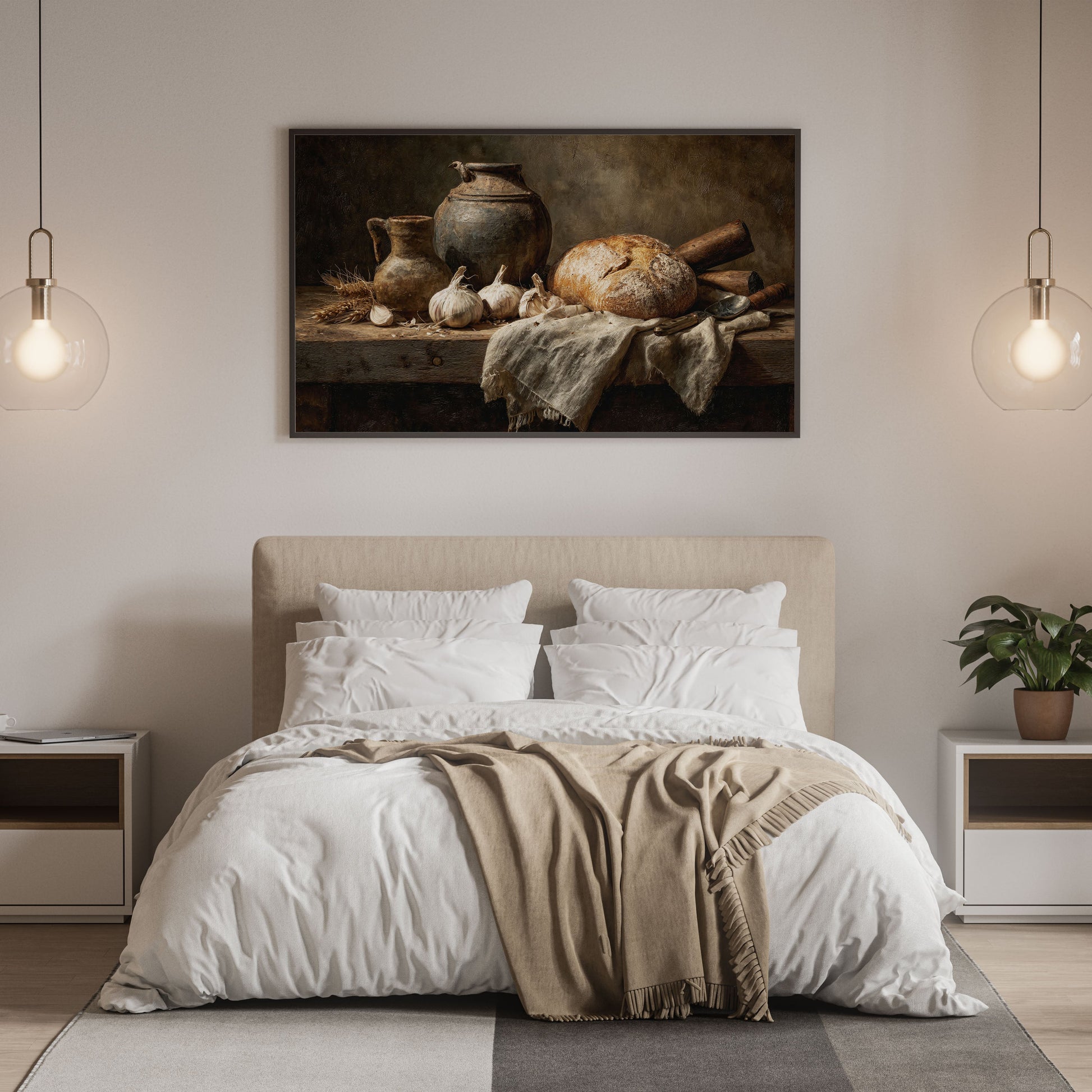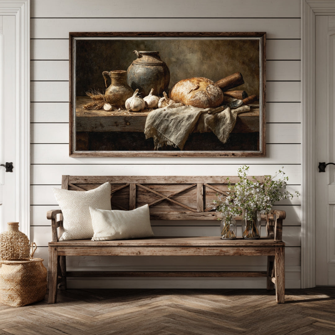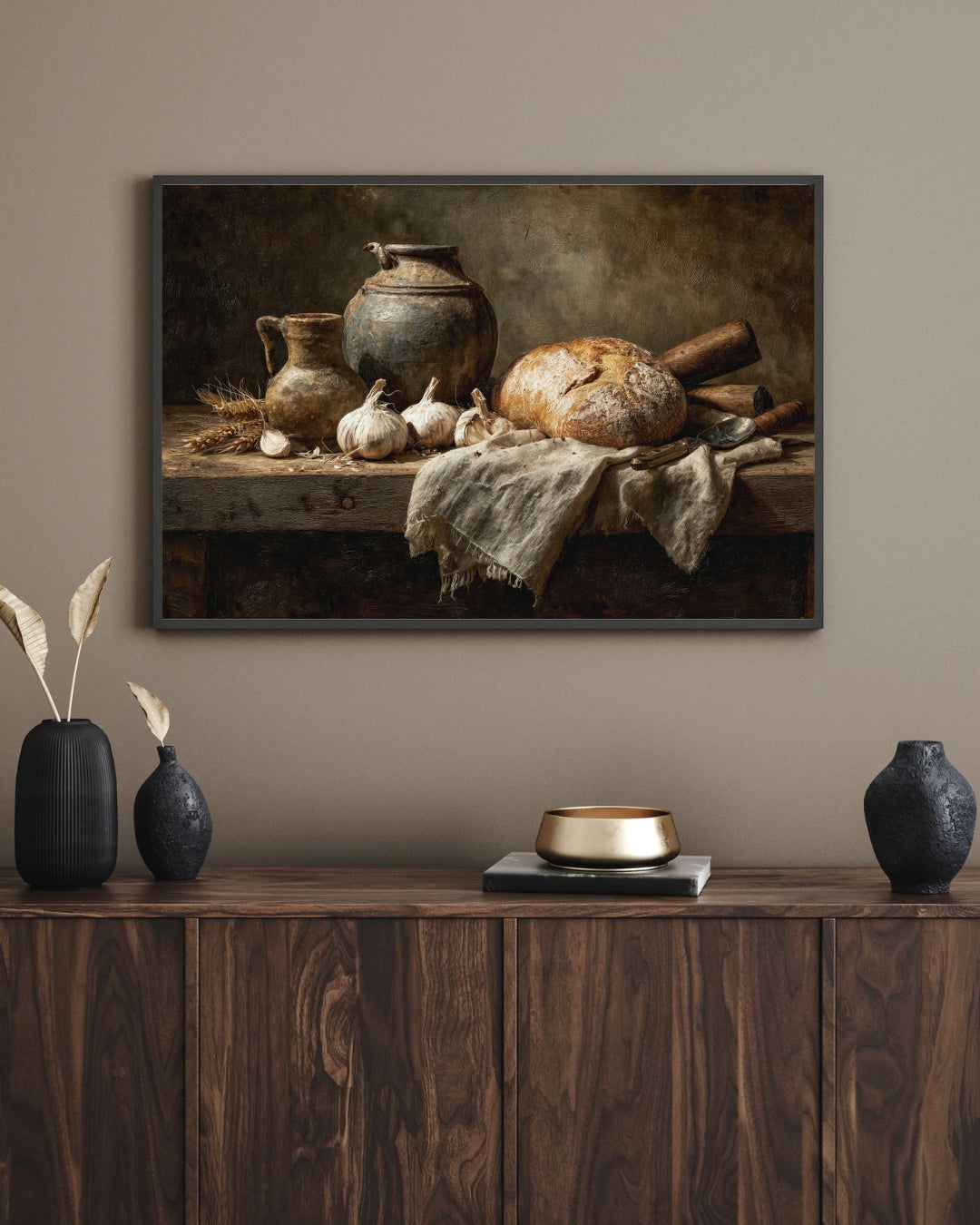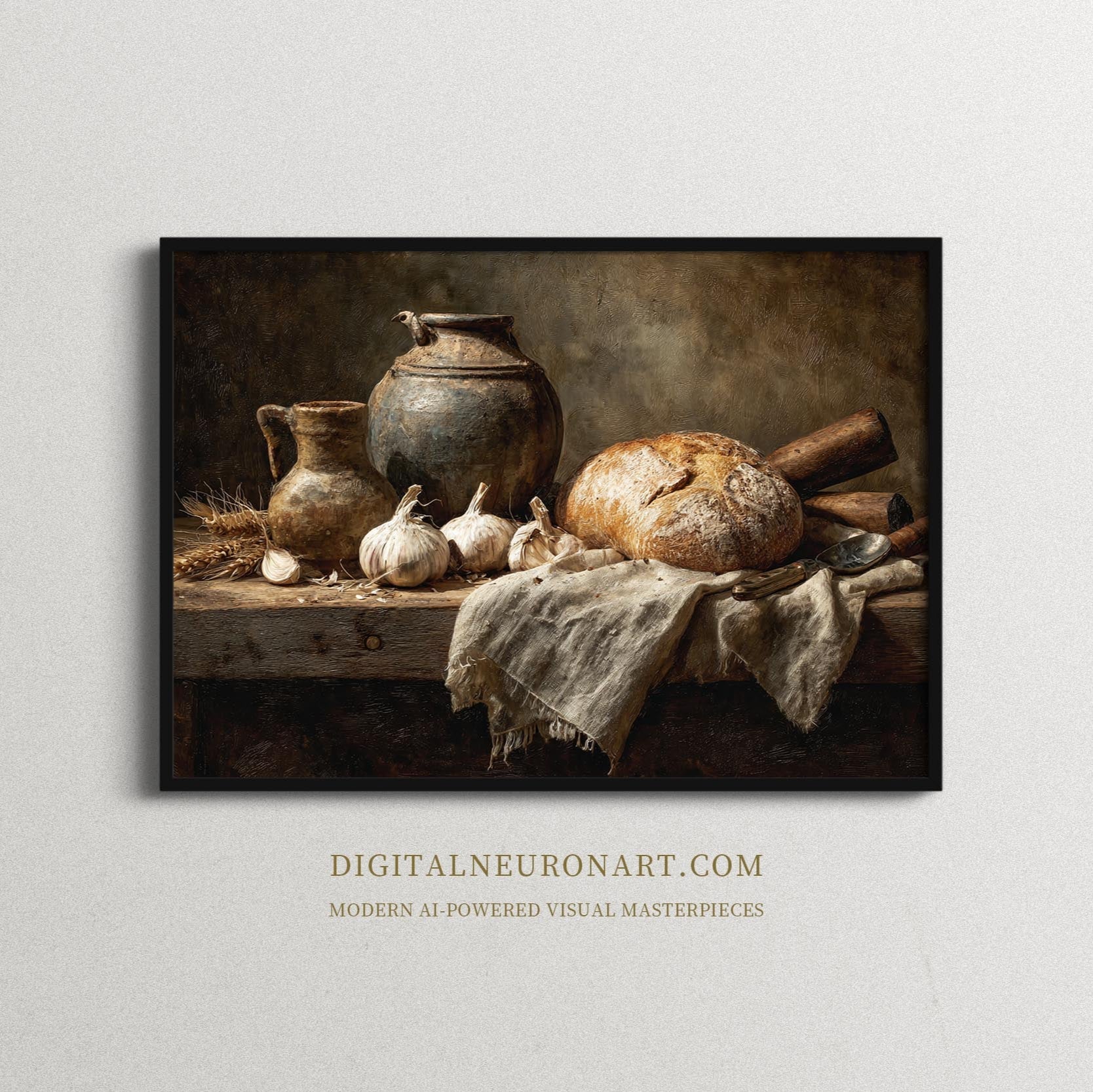 柔和的泥土色调和戏剧性的明暗对比灯光营造出一种让人联想到 17 世纪荷兰静物的氛围 - 非常适合乡村农舍内部、烹饪工作室、面包店或舒适的厨房画廊。