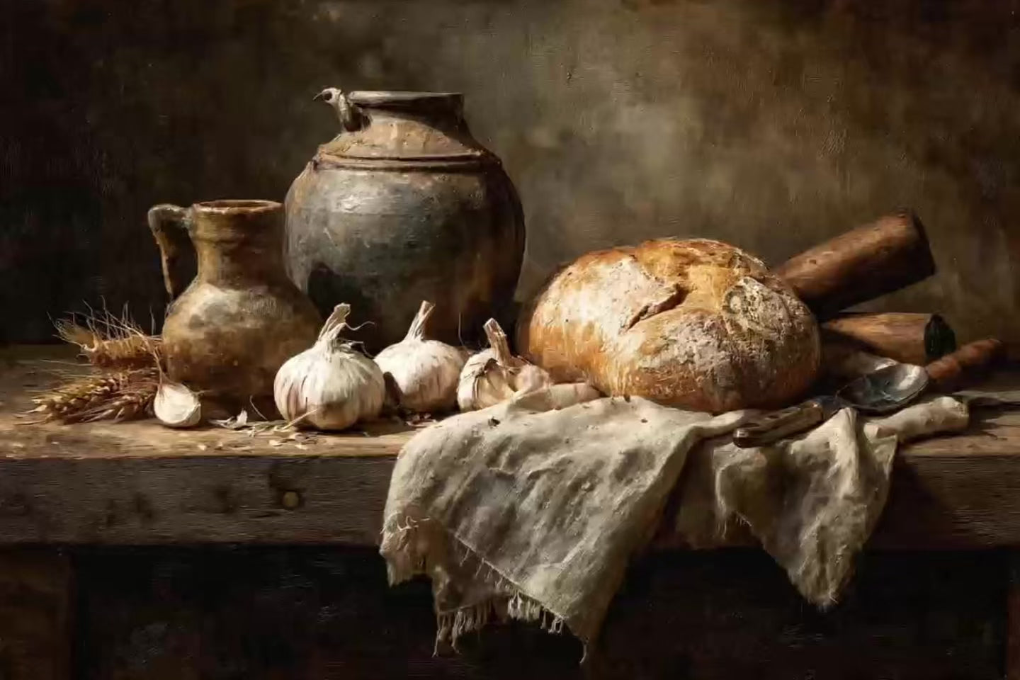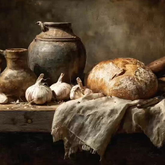 这幅精美细致的静物数字艺术作品,为您的厨房或餐厅增添永恒魅力。作品描绘了质朴的陶器、新鲜的蒜头、酥脆的手工面包,以及摆放在饱经风霜的木桌上的复古亚麻布,唤起了乡村生活的温馨和传统的烹饪仪式。