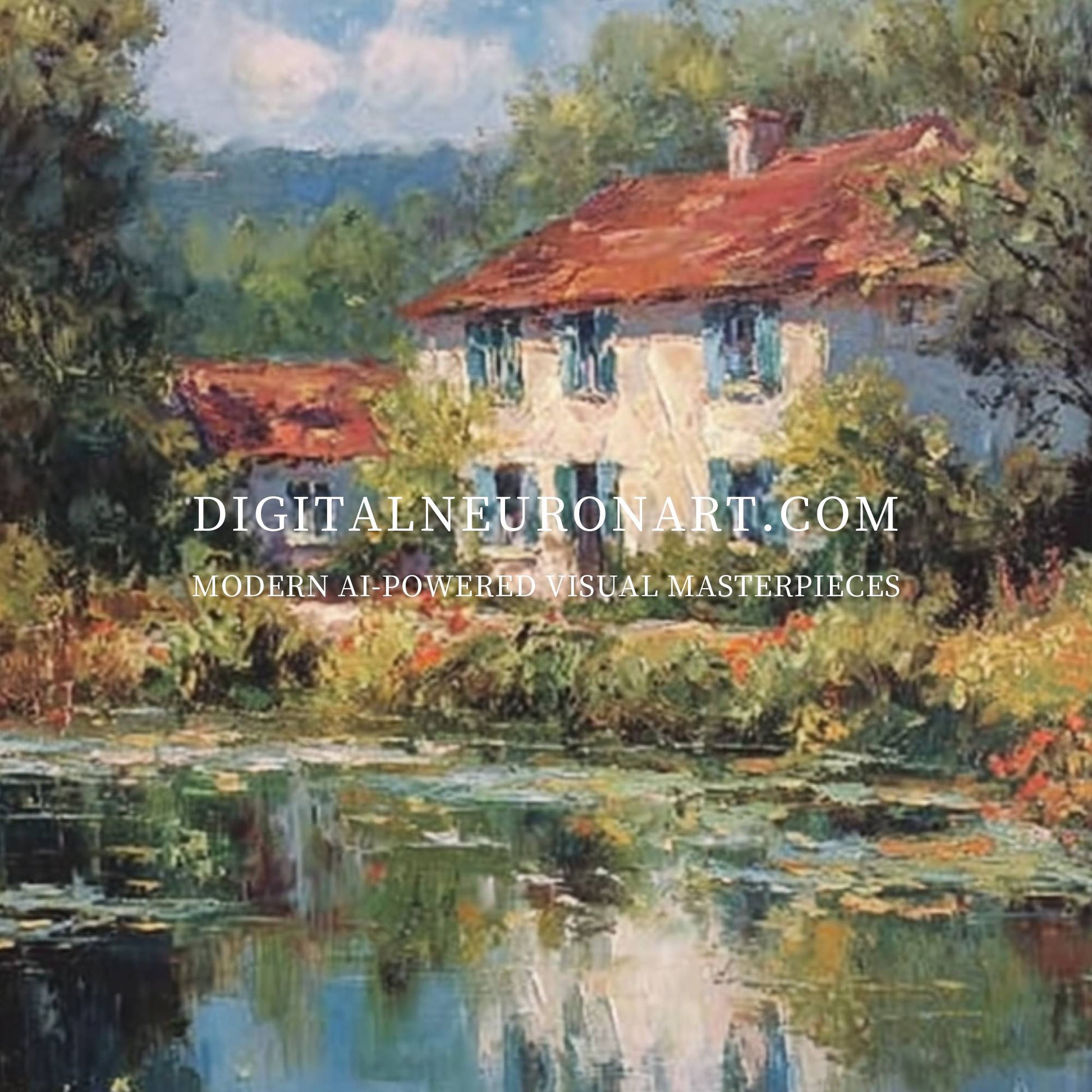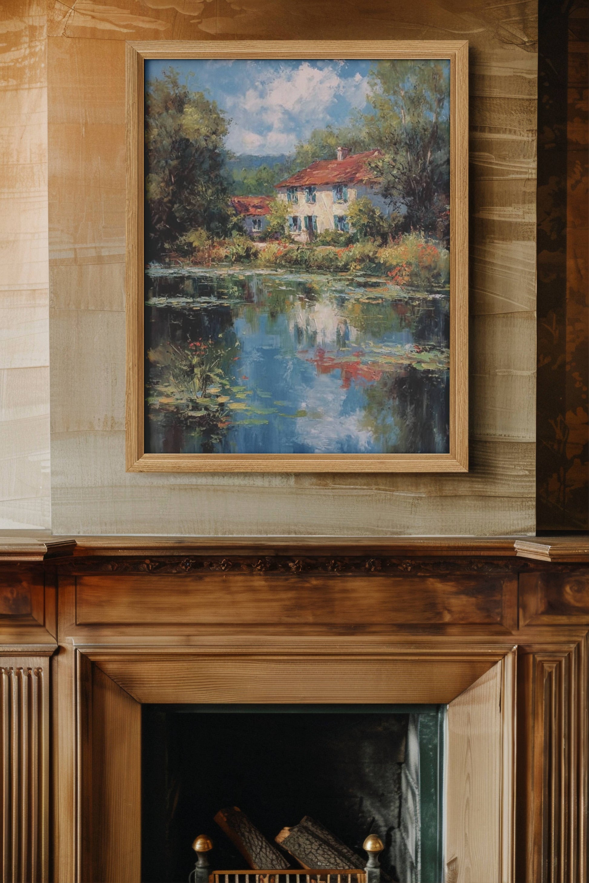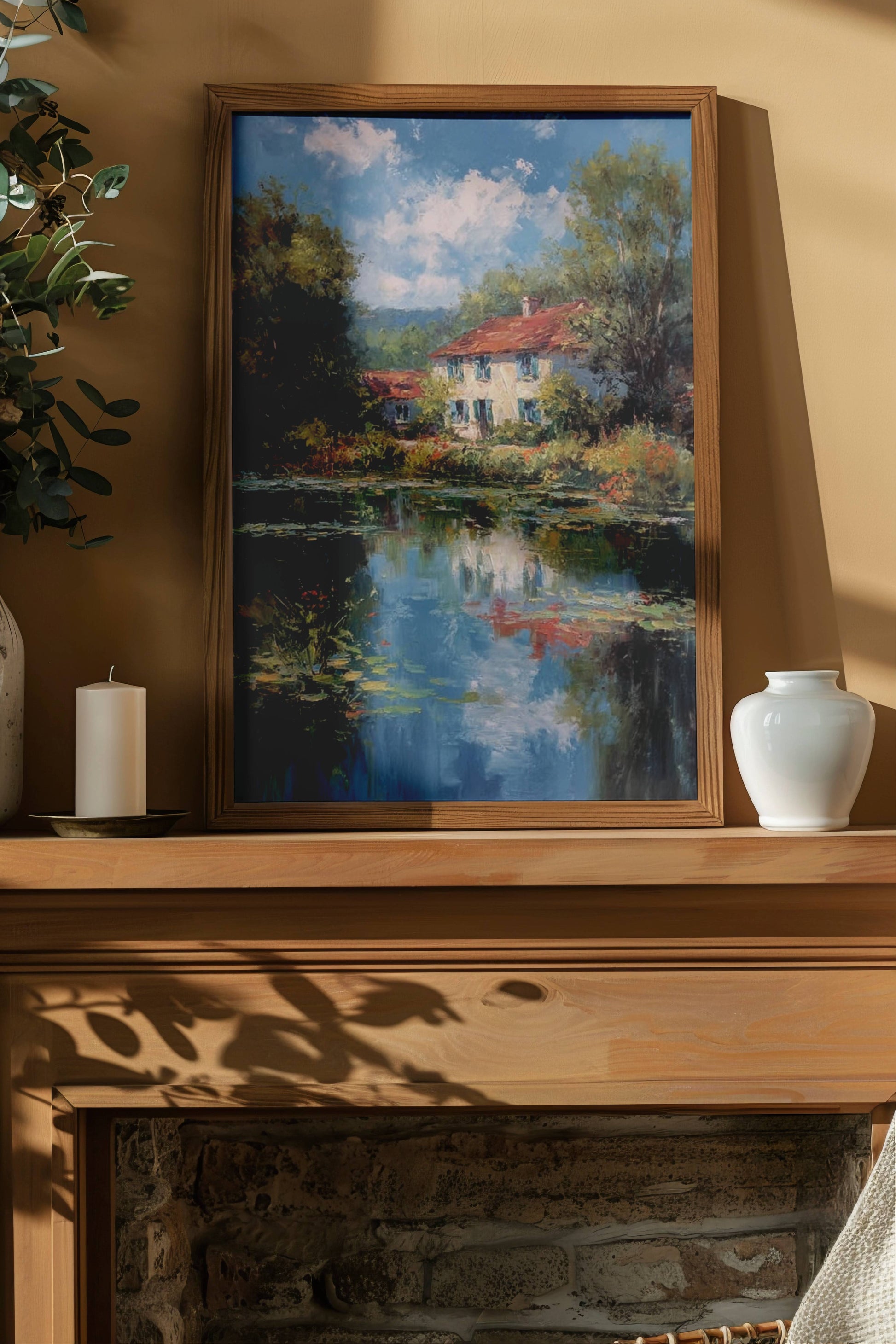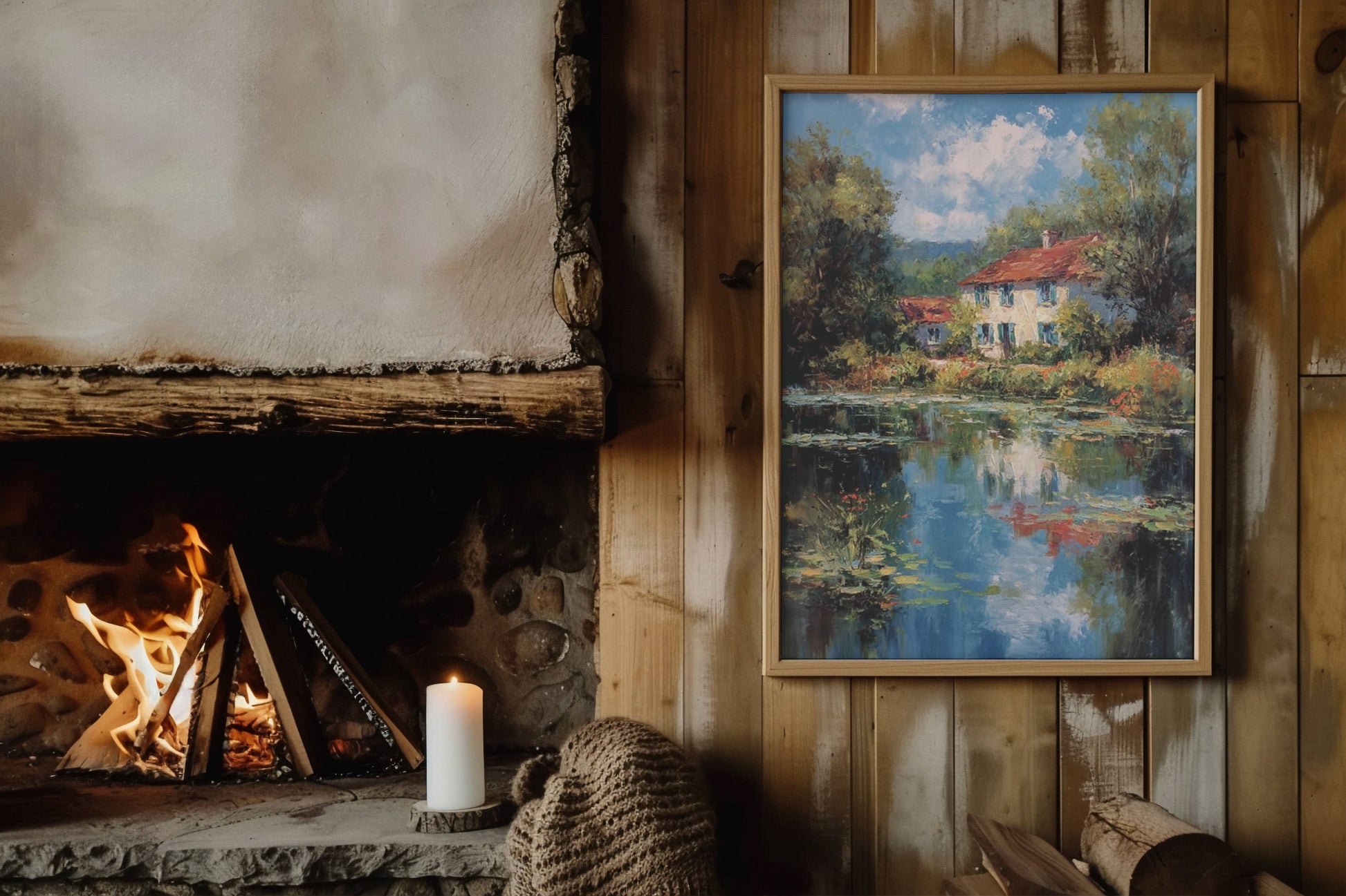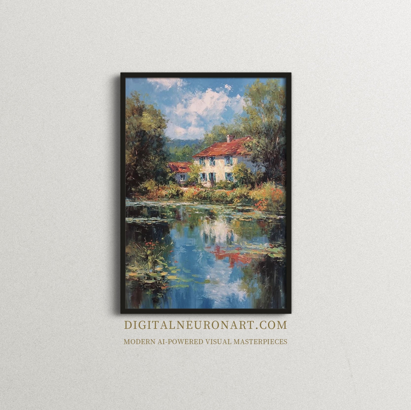 下载这幅高清数字版经典印象派风景画,走进宁静的世界。画中,一座宁静的乡村住宅倒映在平静的池塘中,周围环绕着郁郁葱葱的绿植和鲜艳的花朵,捕捉了大自然永恒的美。这幅可打印的艺术作品非常适合任何需要宁静氛围的房间,为您的空间增添一丝优雅与宁静。