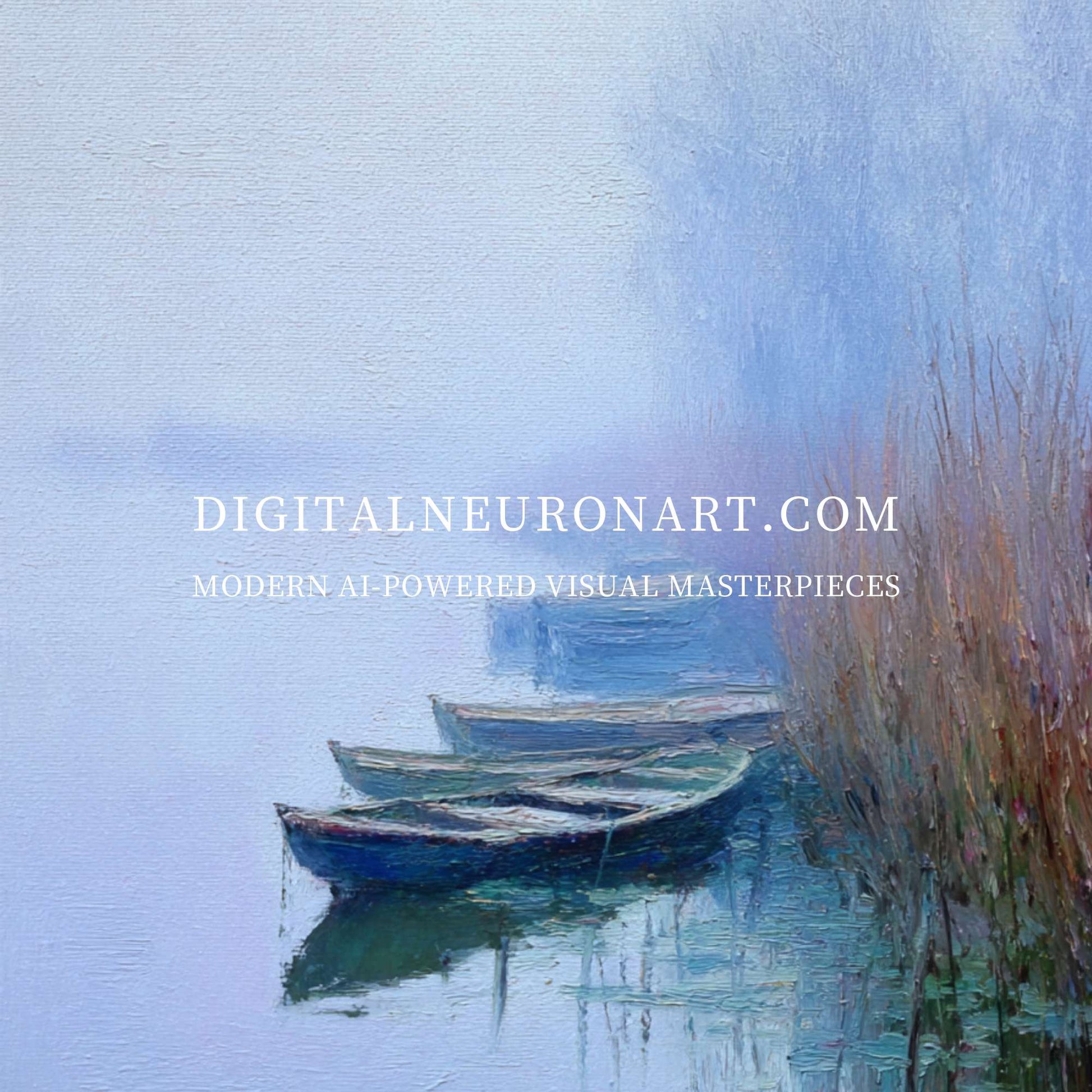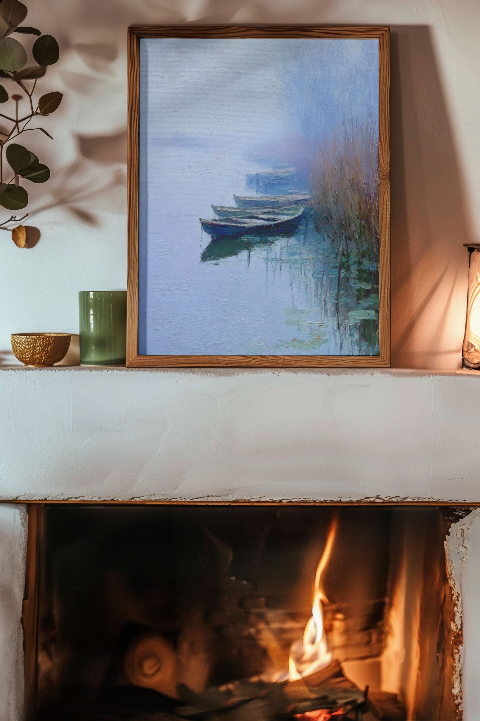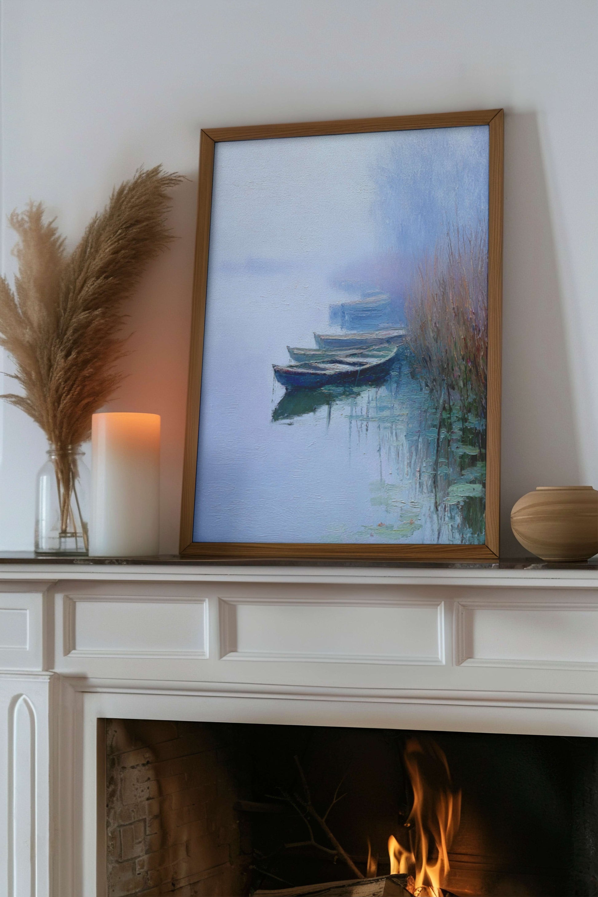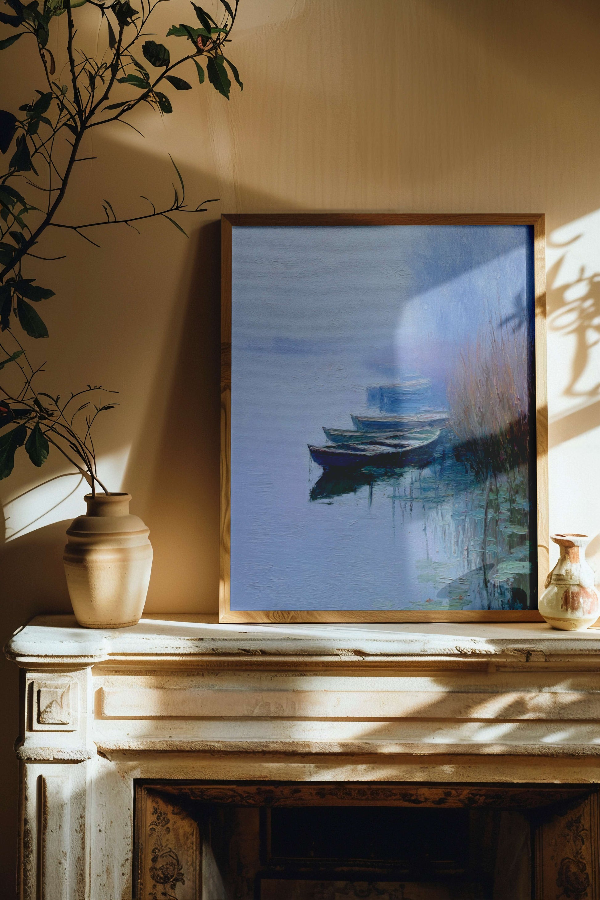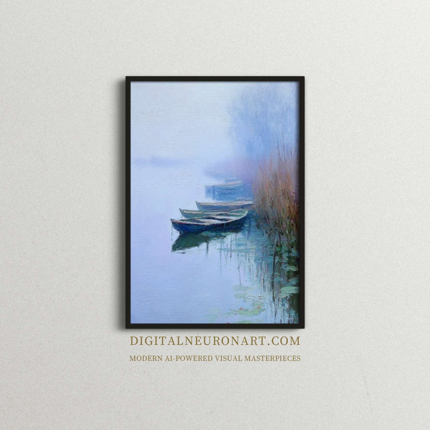 薄雾笼罩的船只停泊在河岸,这幅宁静的景象唤起了一种宁静祥和的感觉。柔和的蓝色与朦胧的白色巧妙融合,营造出一种宁静的氛围,非常适合打造一个放松身心、静思冥想的空间。非常适合自然爱好者和热爱宁静景观的人士。
