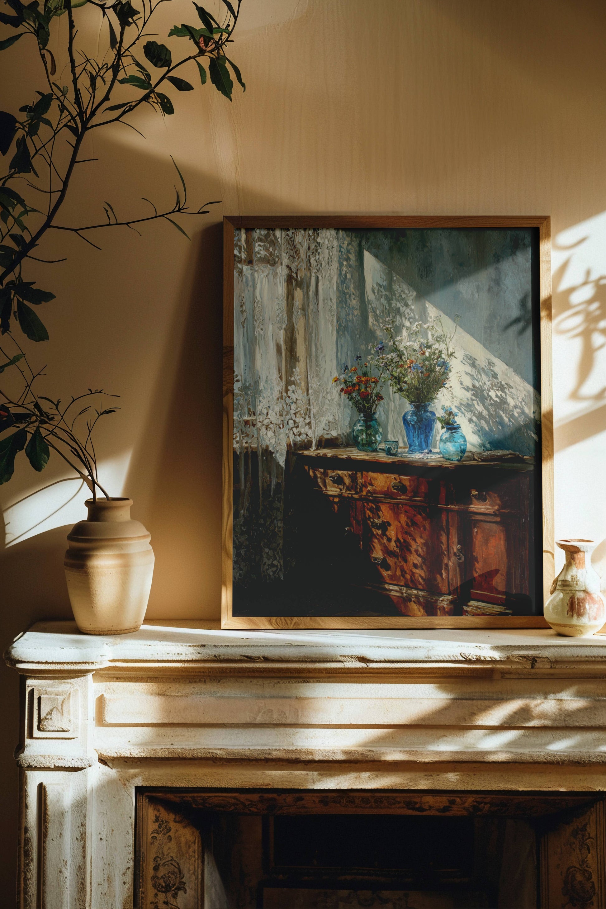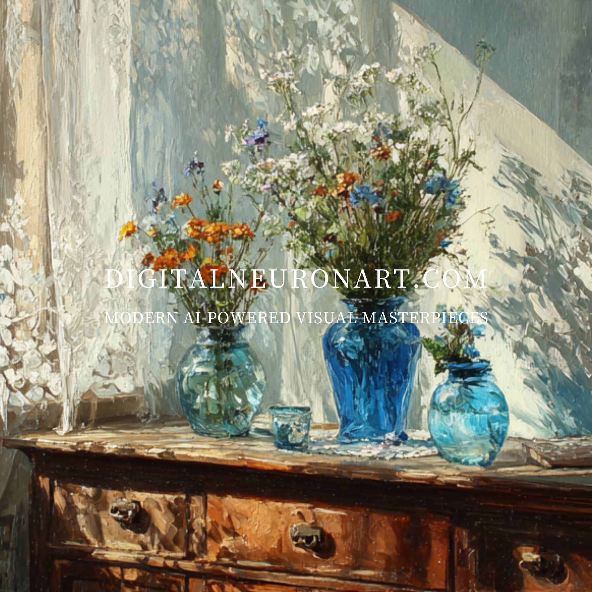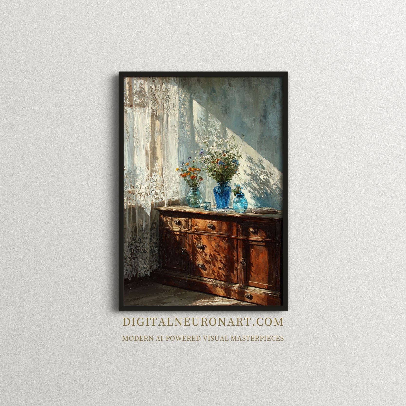 这幅令人惊艳的静物画描绘了一间阳光明媚的房间,蓝色花瓶中插着美丽的花卉。透过蕾丝窗帘的自然光在木质家具上投下柔和的阴影,营造出温暖宜人的氛围。非常适合为您的家居装饰增添一抹宁静优雅的气息。