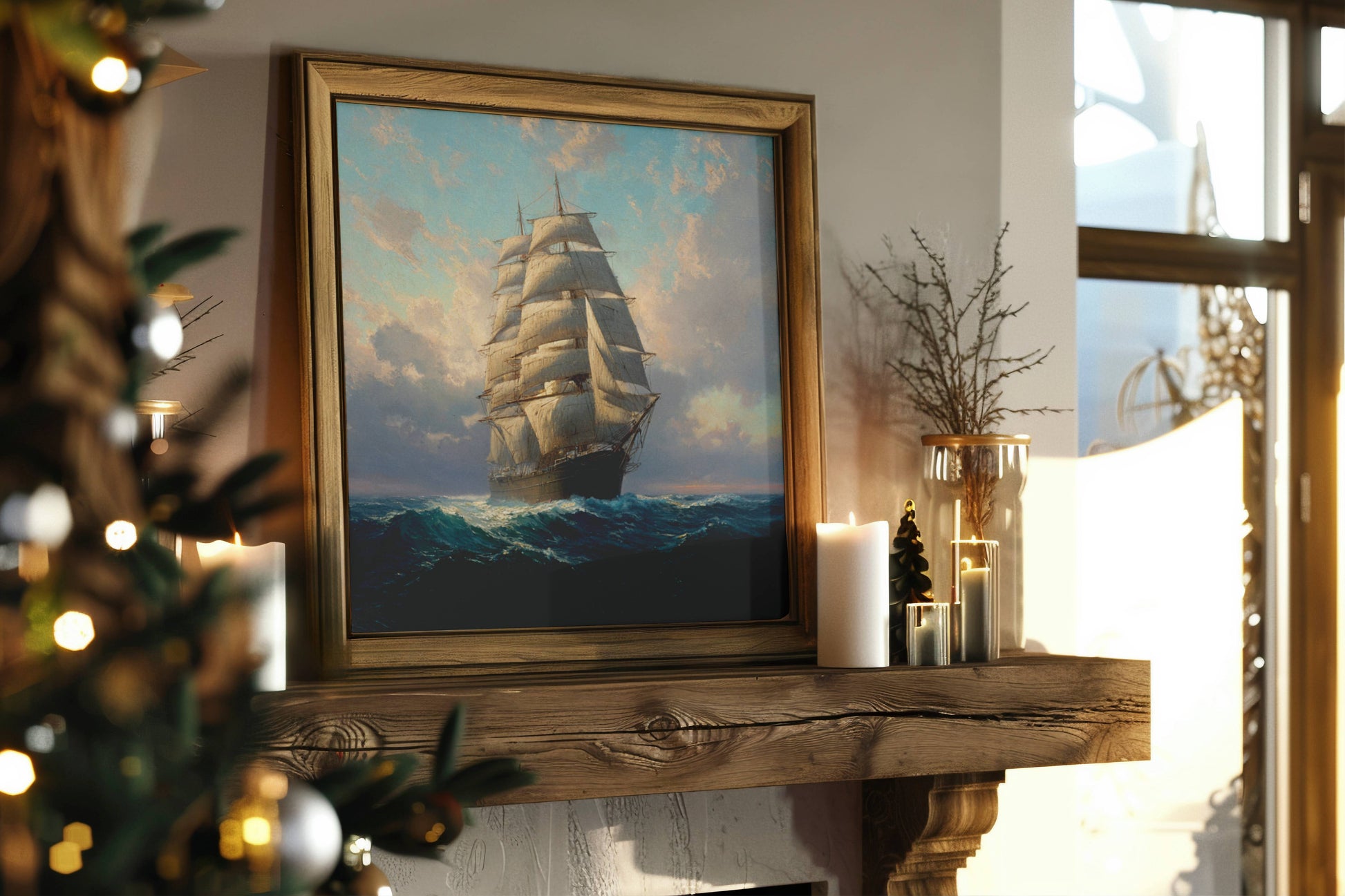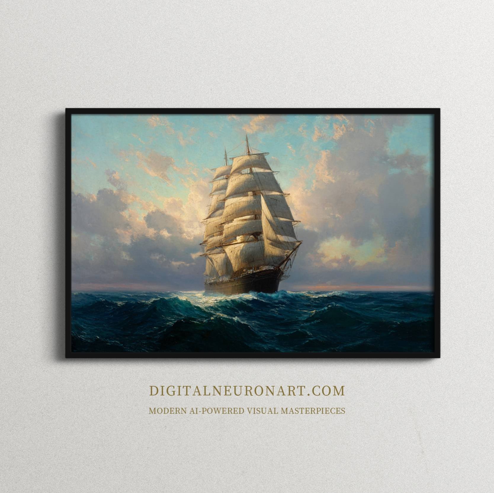 这幅令人叹为观止的数字艺术作品,捕捉了一艘雄伟的帆船在深蓝色海浪中飞驰的动态,为您的家居增添永恒的优雅。这幅作品由 DigitalNeuronArt 运用先进的人工智能技术创作,灵感源自浪漫的航海冒险时代和浩瀚的海洋探索。
