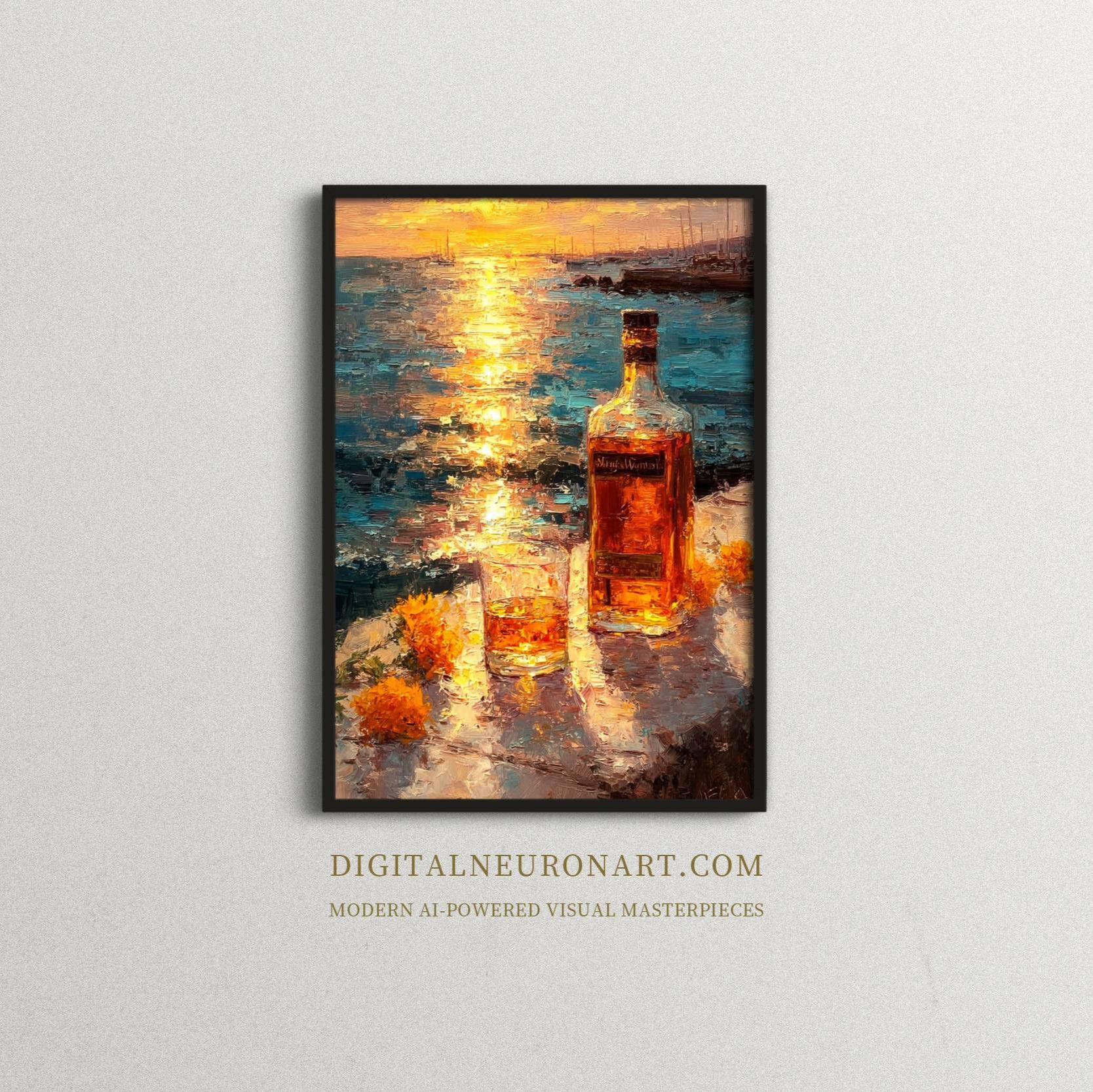 在《日落威士忌倒影》的金色光芒中放松身心。这幅印象派油画捕捉了海上日落的宁静之美,温暖的阳光在海浪间舞动,映照着一杯琥珀色的威士忌及其酒瓶。这幅作品以其富有表现力的笔触和丰富的纹理,将放松、优雅与海滨魅力融为一体。这幅数字下载墙面艺术作品非常适合客厅、家庭酒吧或办公室,为任何空间增添一丝精致与宁静。