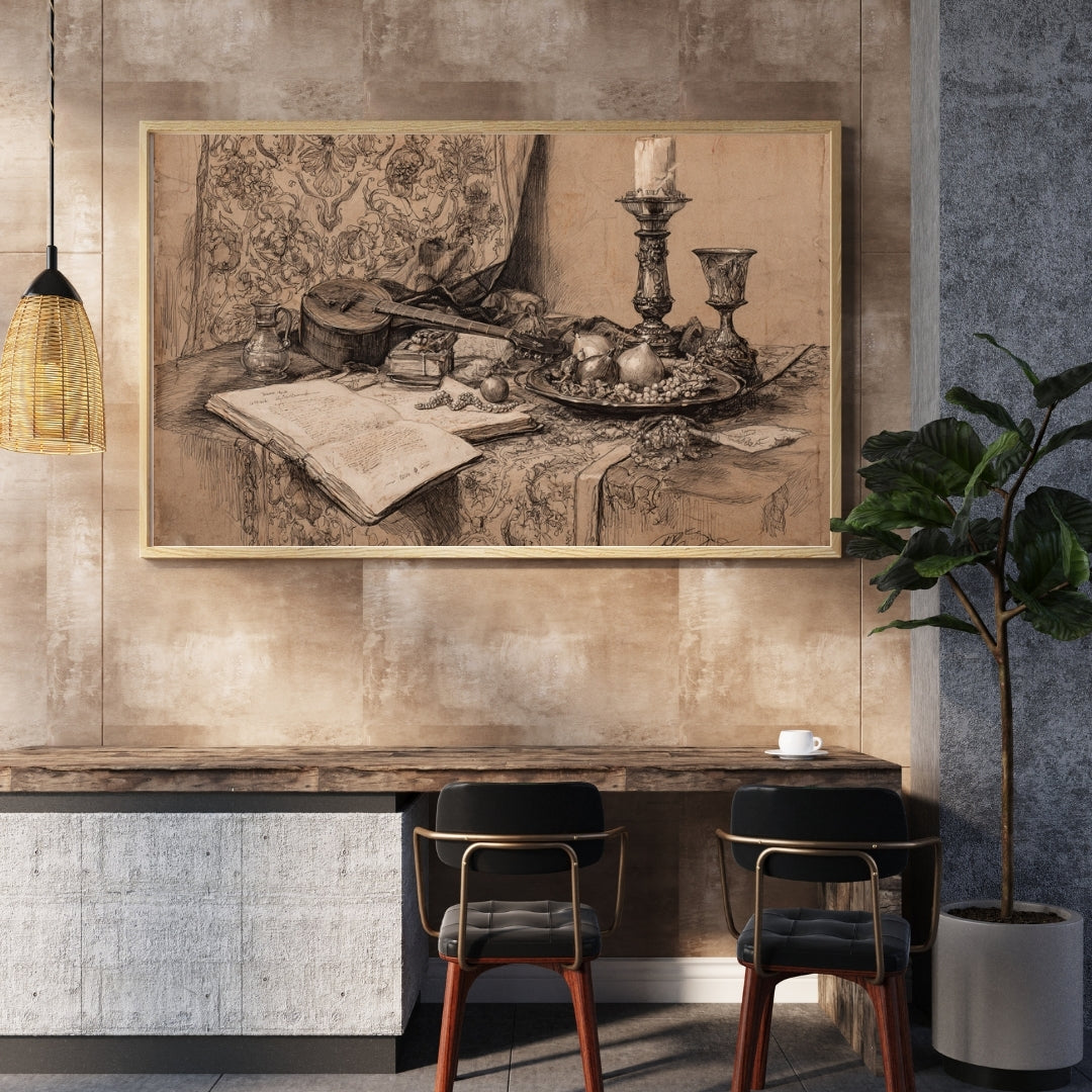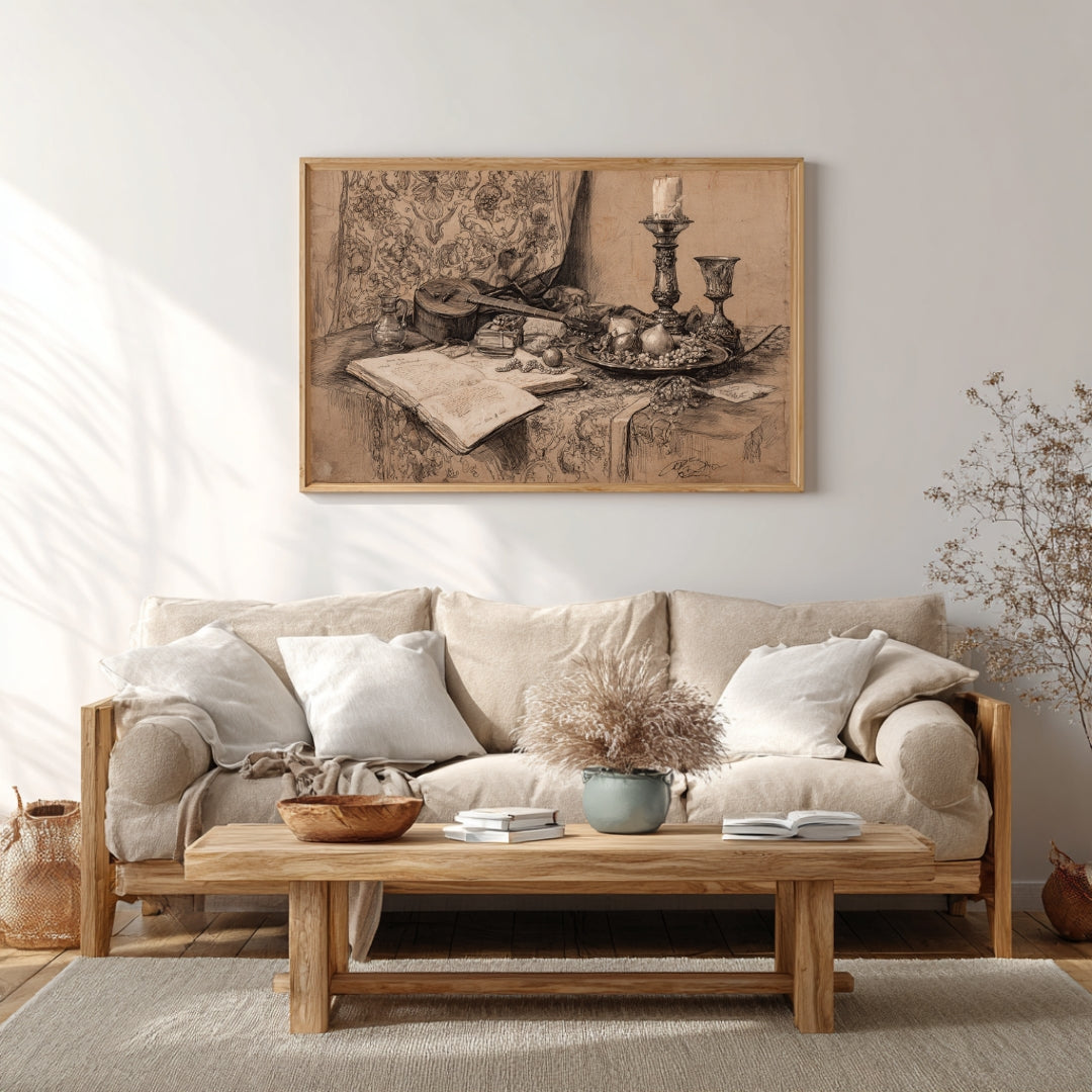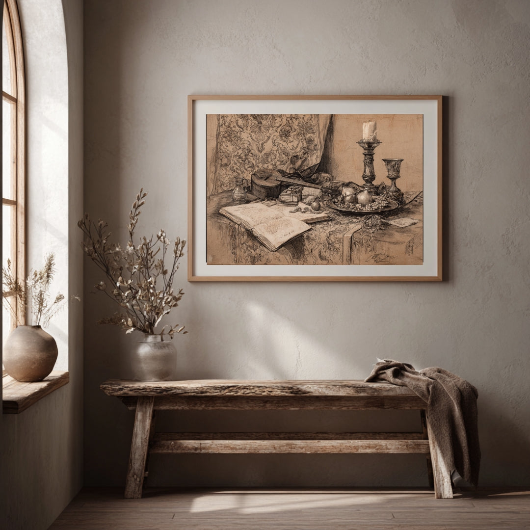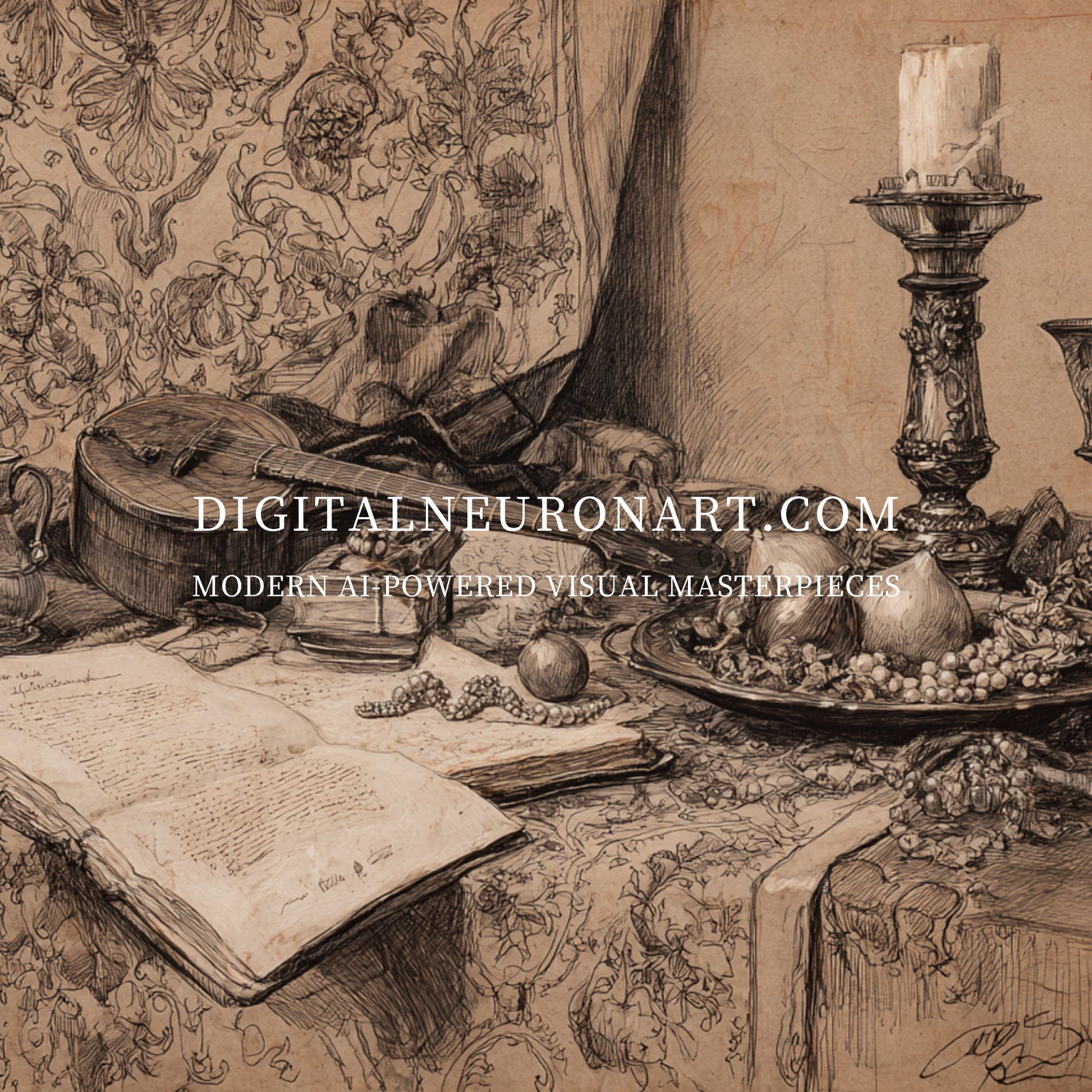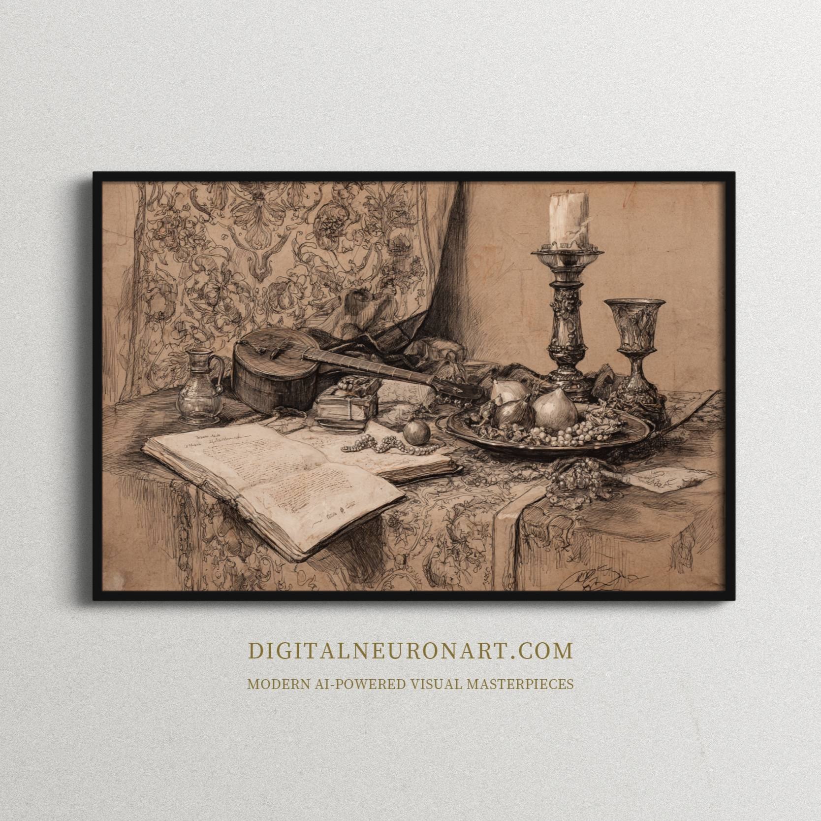 这幅精心手绘的静物作品,带您走进昔日优雅的时代。作品描绘了一把复古琵琶、一支蜡烛、成熟的水果、一个高脚杯,以及铺在图案丰富的桌布上的手写手稿,捕捉了17世纪室内空间的沉思之美。这幅可打印的数字艺术作品采用深褐色调和古典线条,非常适合历史、文学、音乐和古董美学爱好者。