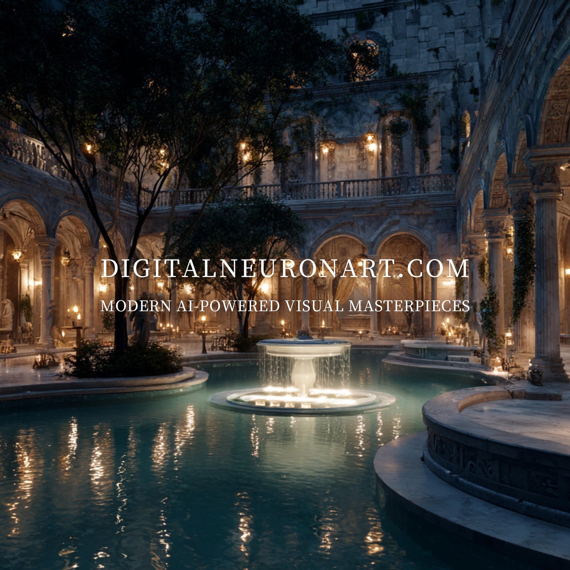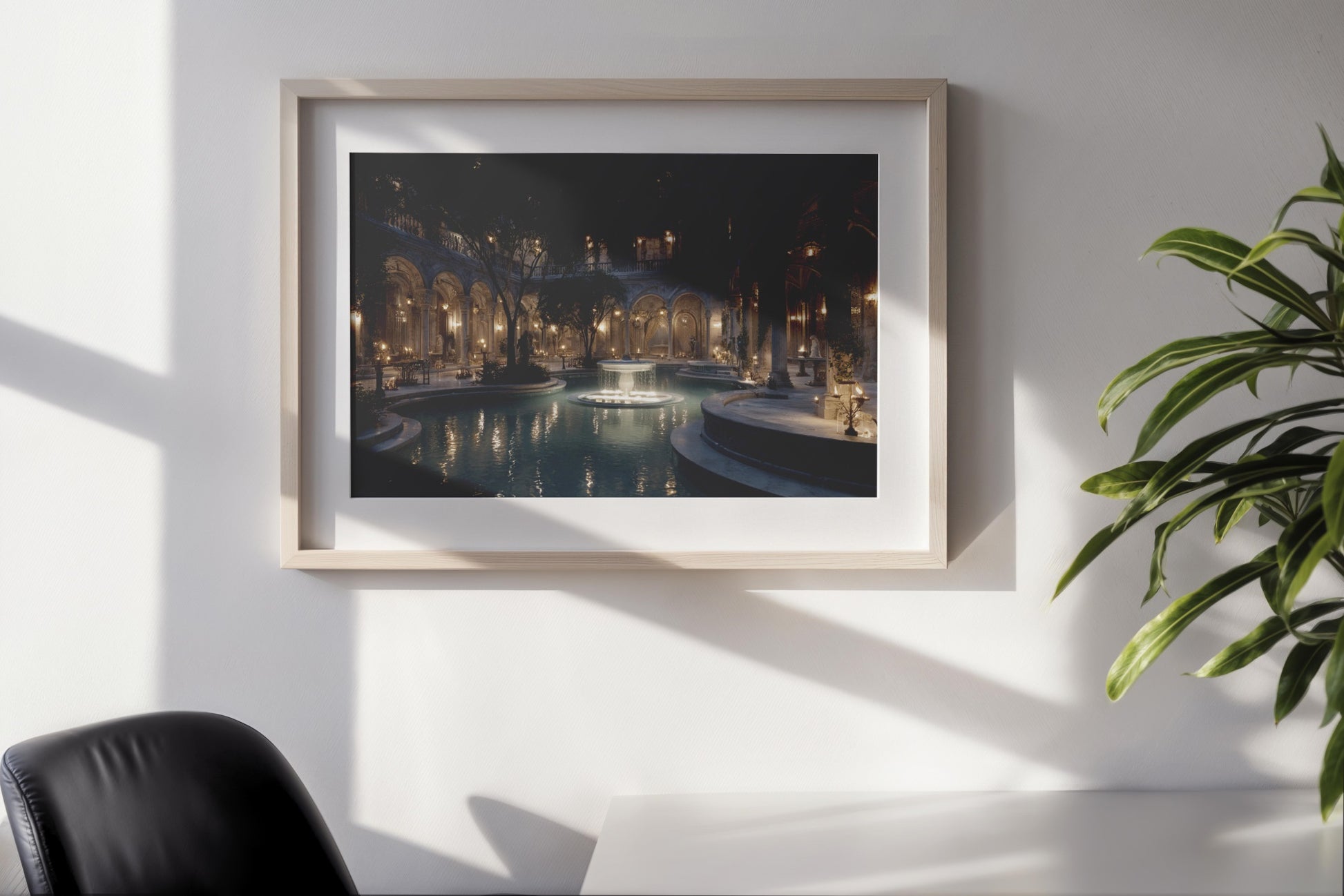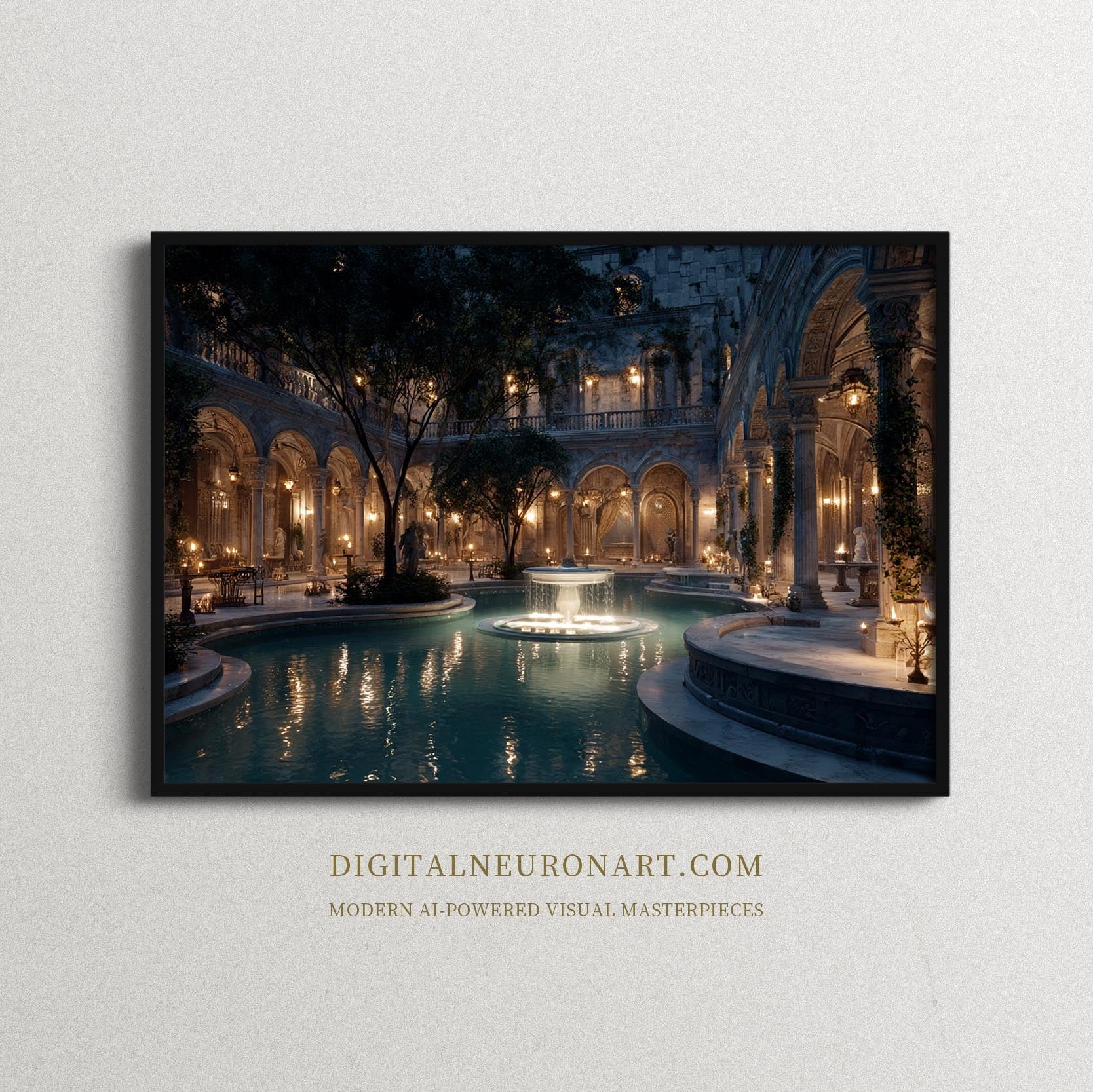 Step into an atmosphere of timeless elegance with Whispers of the Courtyard. This neoclassical digital artwork portrays a moonlit palace courtyard, where gentle lights shimmer upon still waters and ornate arches frame an enchanting fountain. The cinematic play of light and architecture evokes serenity, romance, and classical beauty. Perfect for interior design, luxury spaces, and art lovers seeking a touch of refined tranquility. Delivered as a high-resolution digital download for easy printing and display.