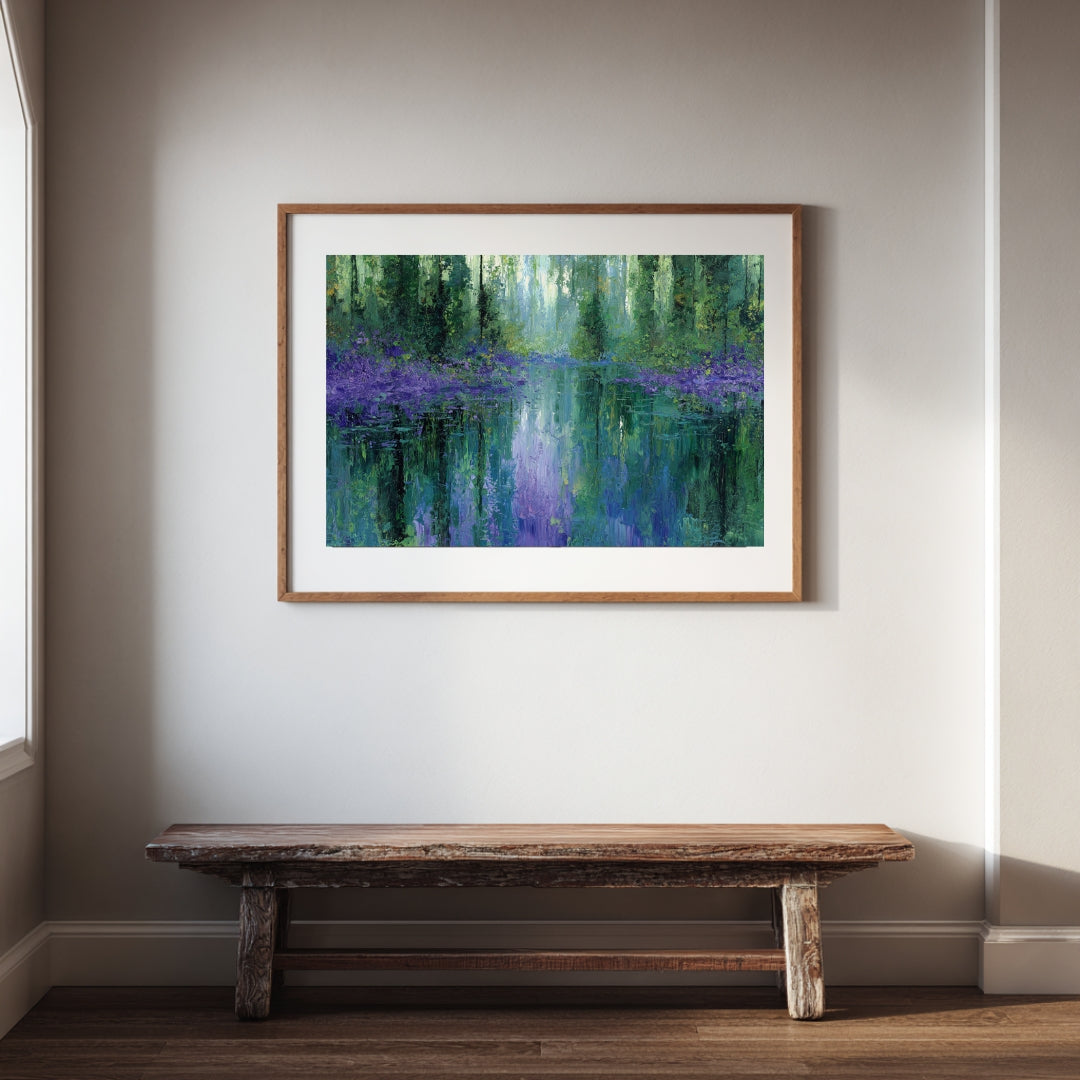 感受大自然的宁静,感受《瀑布低语》这幅印象派风景画,优美地捕捉了水边森林宁静的倒影。鲜艳的绿色和紫色交相辉映,营造出如梦似幻的氛围,水面倒映着茂密的树木和娇艳的花朵。这幅作品将幽静森林的宁静带入您的家中,为任何空间增添一抹宁静的艺术气息。提供高清数字下载,方便您打印并在您喜欢的环境中展示。
