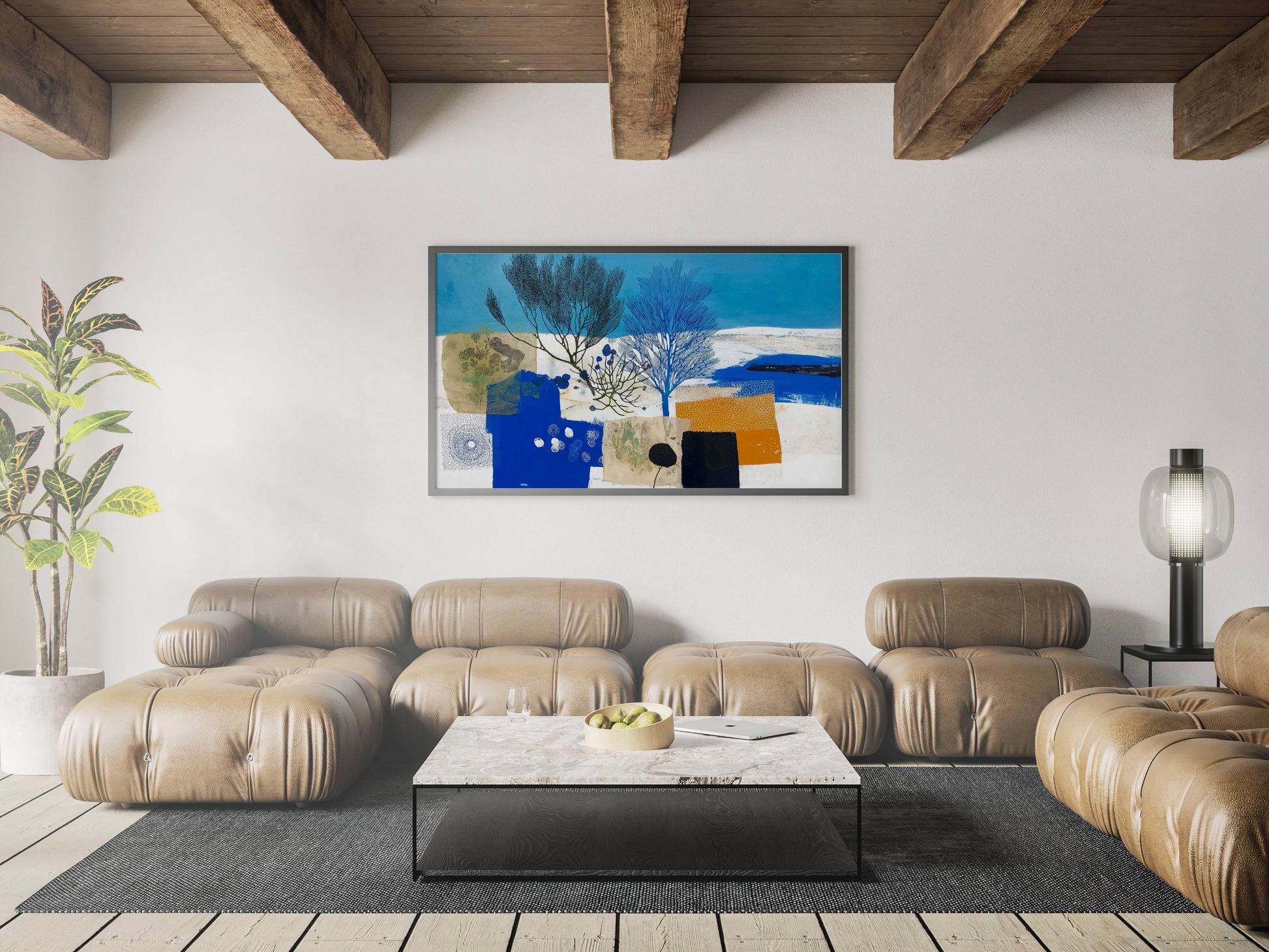 Capture the quiet beauty of nature with Winter Shoreline Trees. This modern abstract landscape painting features delicate tree silhouettes set against cool shades of blue, white, and earthy tones. Geometric blocks of color bring texture and depth, blending natural forms with contemporary abstraction.
